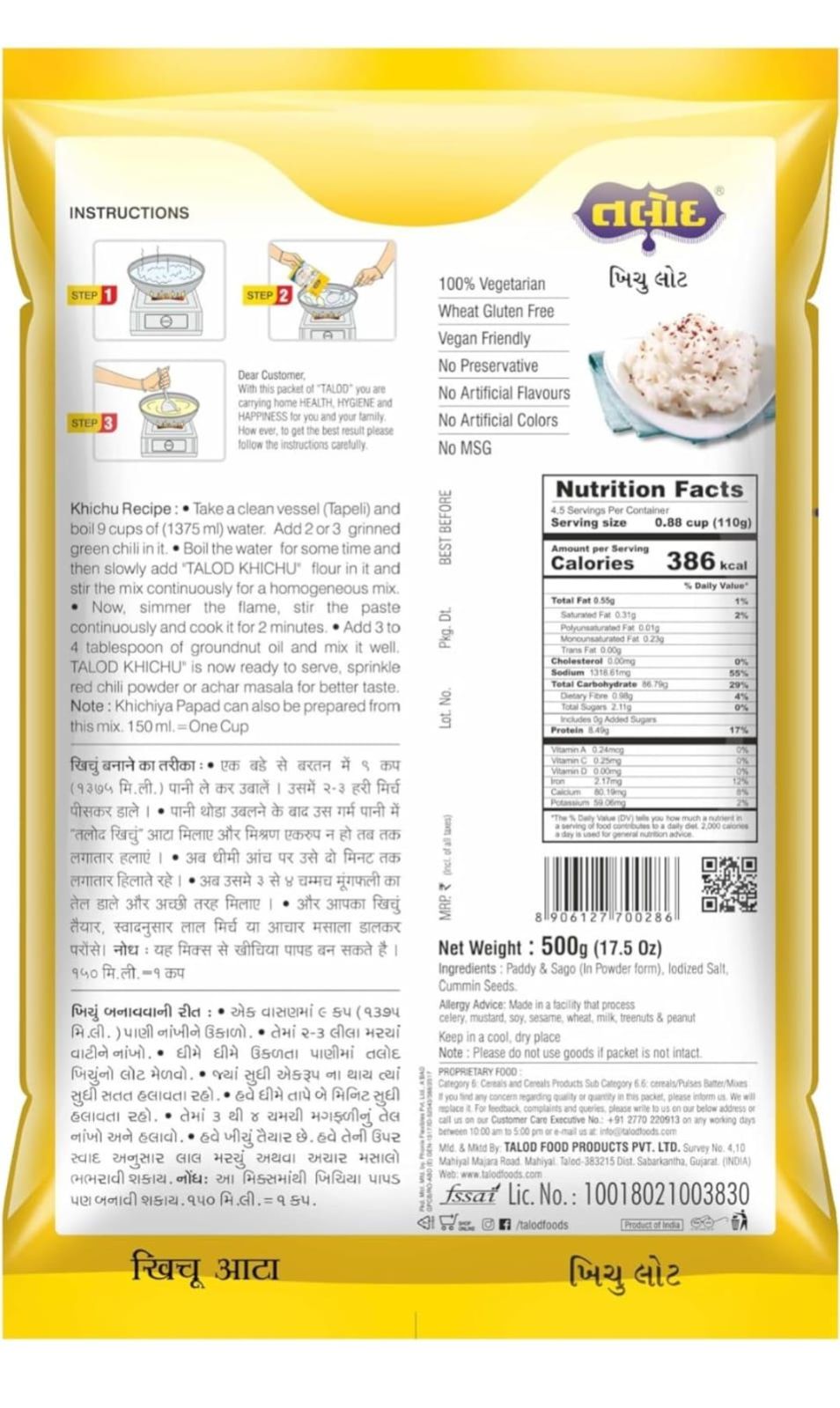 Made from high-quality ingredients: Talod Instant Mix Khichu Flour is made from premium quality ingredients to ensure that it is both healthy and delicious.