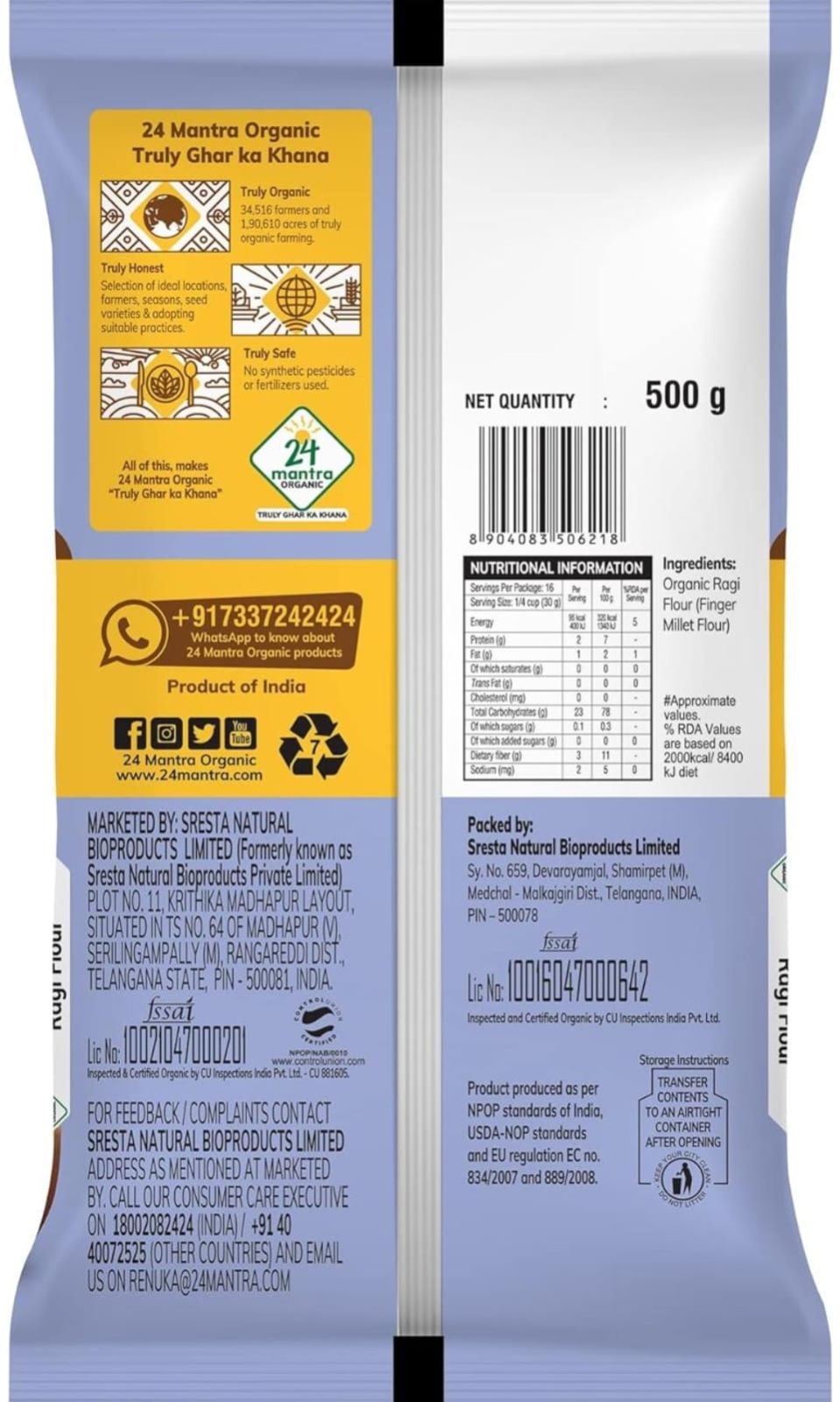 24 Mantra Organic Ragi Flour/Finger Millet/Nachni Flour - 500gms | Pack of 1 | Chemical Free & Pesticides Free | Naturally Gluten-free