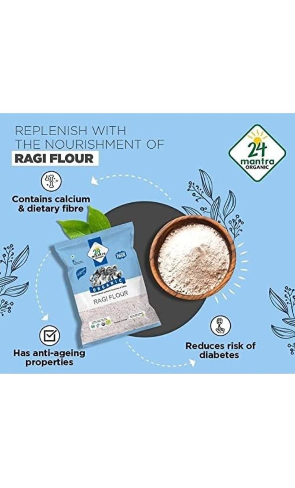 Finger millet belongs to the family Poaceae and is known as Ragi in India. Ragi flour in Karnataka is mostly used to make balls, popularly known as “ragi mudda”. 24 Mantra Organic Ragi flour/ Ragi Atta is made from unadulterated whole grain. These Ragi grains are not colored with any artificial colors. Ragi is a good source of complex carbohydrates, a fair source of protein and a good source of fiber and very low in fat. Ragi flour/ Ragi Atta is rich in fiber and contributes towards fullness which contributes towards achieving ideal body weight.