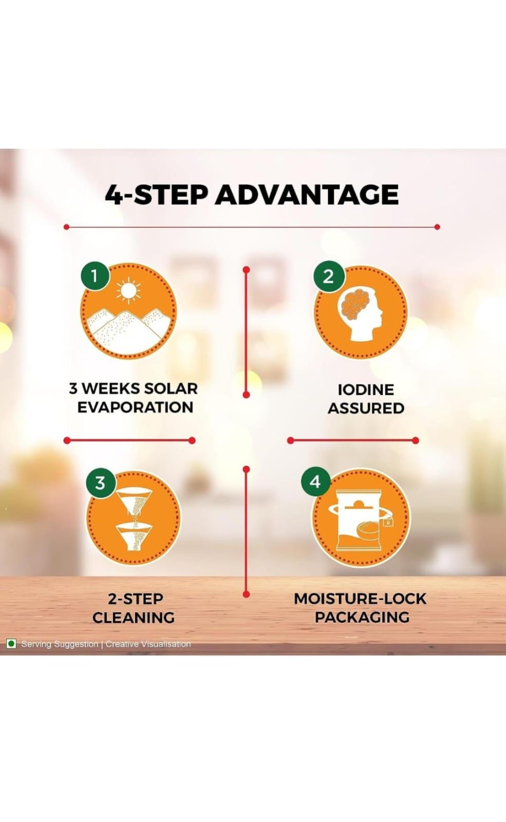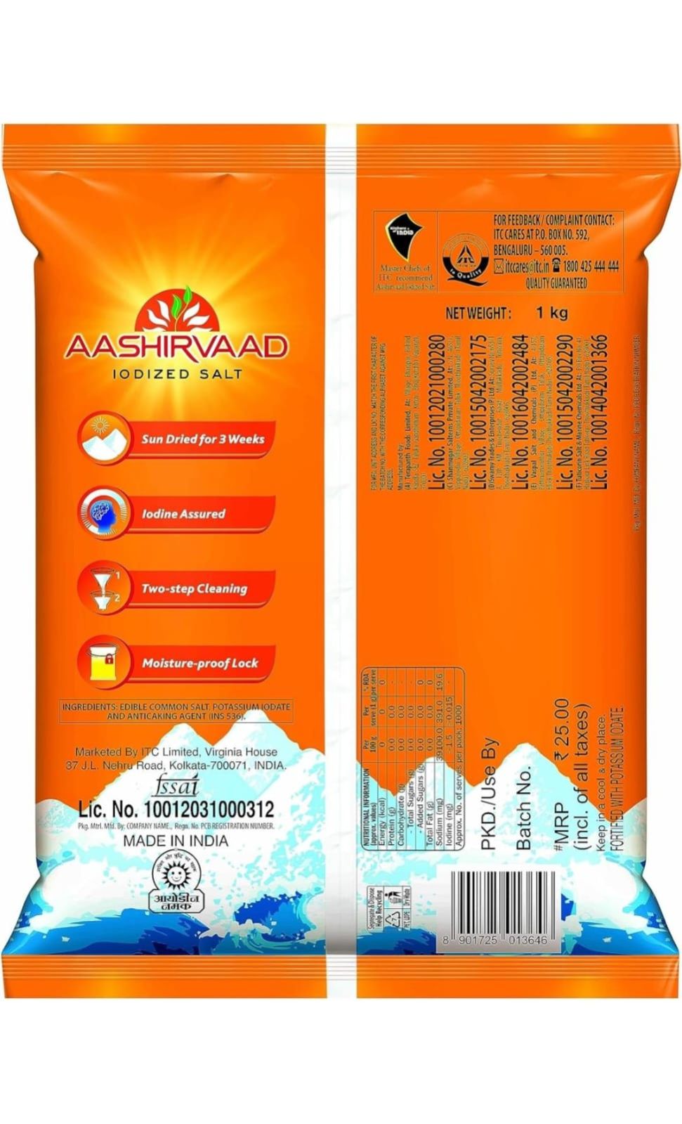 Aashirvaad ensures that only good quality ingredients reach your kitchen and Aashirvaad Iodised Salt stays true to that promise. Made from natural sea salt crystals with a 4-step advantage process, Aashirvaad Iodised Salt ensures that you and your family receive pure goodness of nature, daily. Aashirvaad Iodised Salt is obtained by first, evaporating sea water or brine in shallow basins by sunlight and wind for 3 weeks. When the water evaporates, a salt bed forms at the bottom of the basin. This salt is then collected, and put through an elaborate cleansing process and finally, enriched with Iodine to take care of your family’s Iodine requirements. The moisture-proof packaging ensures a free-flowing granular form that enables easy handling as well as clean storage. Aashirvaad Iodised salt's 4 step advantange is what gives your meals a balanced, original taste - free of any impurities. We take extra care to ensure that only quality salt reaches your home. Simply because we know that it is the only way you would have it! About Aashirvaad: Aashirvaad stands for purity, expert sourcing and quality, and believes in giving you nothing but the best. Hence the ingredients are carefully hand-picked and processed with the same love and care with which you prepare your food. Aashirvaad has a wide range of products - atta, ghee, salt, spices and instant mixes. To lock in the freshness and nutritional quality of its products, Aashirvaad uses world class packaging technology which retains the original, high quality flavour. About ITC ITC is one of India’s foremost companies with its presence in FMCG, Hotels, Packaging, Paperboards & Specialty Papers, Agri & IT Businesses. ITC Brands are designed and customized to delight diverse tastes, needs and lifestyles. With quality and innovation at the core along with contemporary packaging, customer insights and a formidable nationwide distribution network, ITC has been delighting millions of households every day since 1910. A brand that is made in India, for the world.