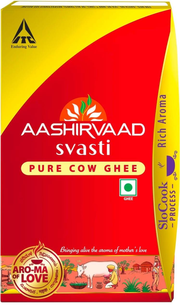 Aashirvaad Svasti Pure Cow Ghee is made with a special SloCook process, similar to the process of making ghee at home. In this process, the ghee is prepared by cooking slowly for about three and a half hours over gradually increased temperatures, which enhances its natural aroma. Enjoy this desi ghee which has a rich aroma, golden granular texture, and consistent quality. Aashirvaad Svasti Pure Cow Ghee not only complements your cooking but also adds a tempting aroma to your dishes. This desi cow ghee naturally contains Vitamin A which is known to support immunity. So, add a spoonful of deliciousness to your meal with Aashirvaad Svasti Pure Cow Ghee.
