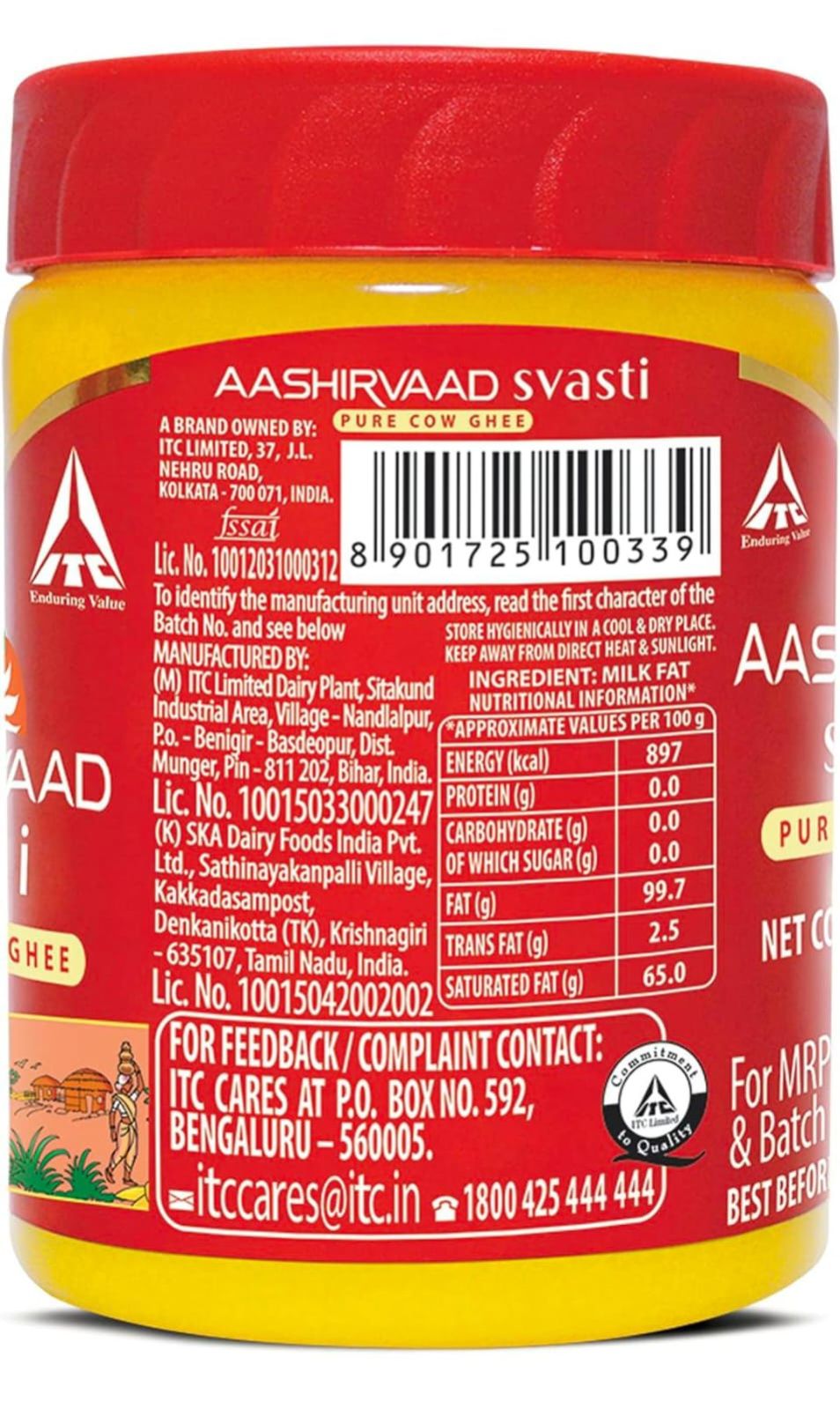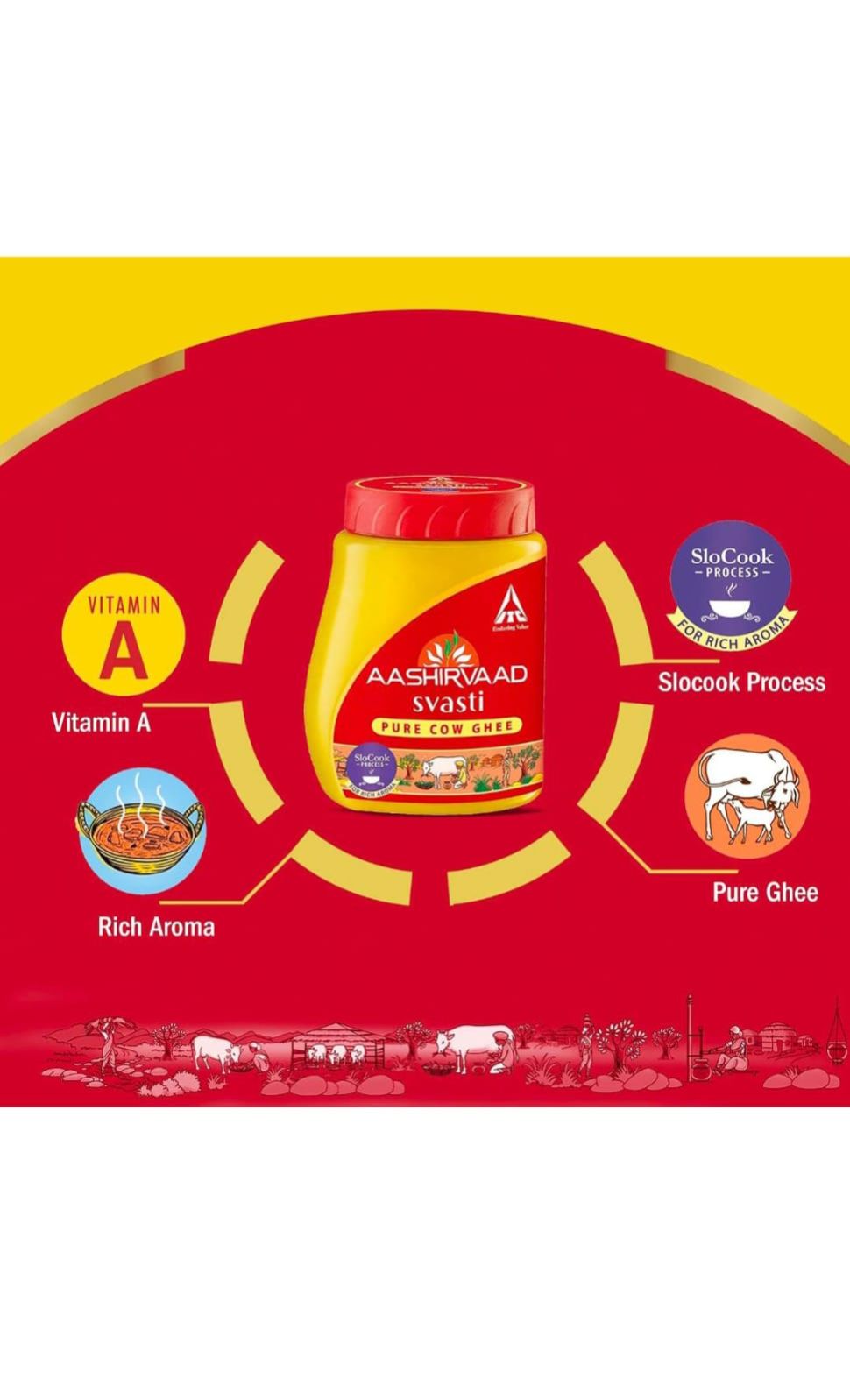 Aashirvaad, the brand that you trust and love, always ensures that only the best quality products reach your kitchen and Aashirvaad Svasti Pure Cow Ghee stays true to that. Aashirvaad Svasti Pure Cow Ghee has been made with love in India, going through a 4-stage stringent quality process. Aashirvaad Svasti Pure Cow Ghee is made with a special SloCook process, similar to the process of making ghee at home. In this process, the ghee is prepared by cooking slowly for about three and a half hours over gradually increased temperatures, which enhances its natural aroma. Enjoy this desi ghee which has a rich aroma, golden granular texture, and consistent quality. Aashirvaad Svasti Pure Cow Ghee not only complements your cooking but also adds a tempting aroma to your dishes. This desi cow ghee naturally contains Vitamin A which is known to support immunity. So, add a spoonful of deliciousness to your meal with Aashirvaad Svasti Pure Cow Ghee.