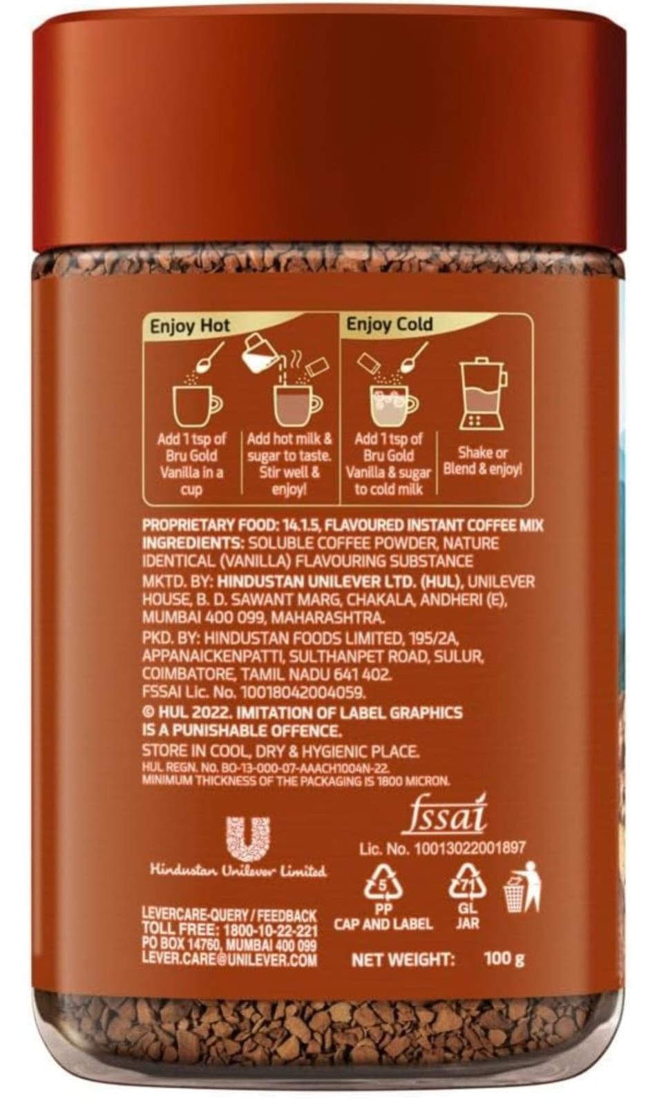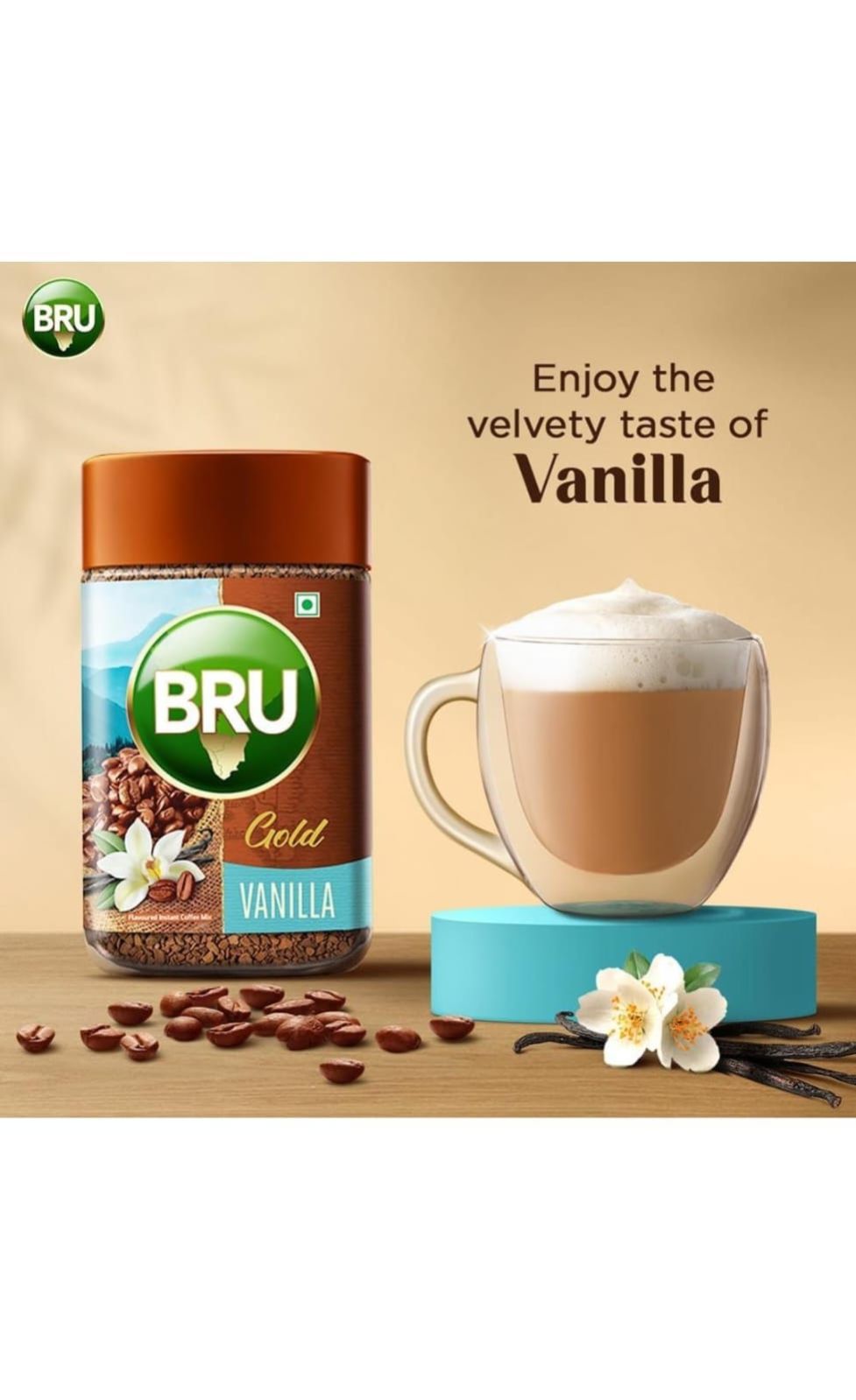 Delicious, Delightful and Decadent! Introducing the new Bru Gold Flavoured Coffee range to elevate your coffee experience. Indulge your senses with the exquisite flavour of Bru Gold Vanilla, the epitome of luxury in flavoured coffee. With every sip, Bru Gold Vanilla delivers a harmonious balance between the enchanting sweetness of Vanilla and invigorating taste of freeze-dried coffee. At Bru, we source the choicest Arabica & Robusta beans from South India which undergo our meticulous freeze-drying process. Our freeze-drying process ensures that each granule of coffee bursts with intense aroma and flavour. Bru Gold Vanilla is a versatile blend that tastes delicious both hot and cold. To make your own delicious cup of coffee with a Vanilla twist: Add a teaspoon of Bru Gold Vanilla to either hot or cold milk along with sugar to taste and mix, shake or blend to enjoy the burst of flavours! Bru Gold Vanilla will transform your usual cup of coffee into a luxurious treat. Embrace this extraordinary symphony of flavours that will awaken your taste buds like never before. Also available in two other flavours - Bru Gold Caramel & Bru Gold Hazelnut. Try all three flavours today and upgrade your daily cup of coffee into a cup of delight!
