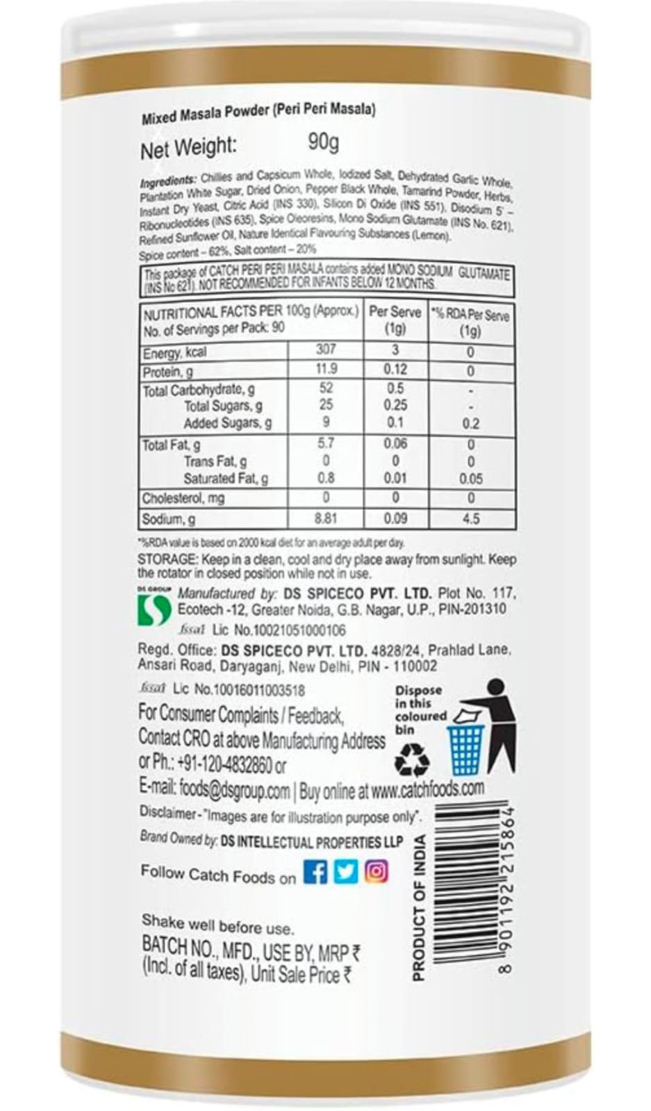 Spice up your salads, snacks and fruits by sprinkling a pinch of Catch Peri Peri Sprinkler. Be it french fries, nuggets, Pizza this spice works its magic in every dish! Catch Peri Peri Masala Sprinkler is a blend of choicest spices blended to gibe you perfect tang. With the sprinkler pack, adding Chat Masala to your food becomes an easy affair. Catch Ka Koi Match Nahi. 100%. Keep in clean,cool and dry place away from sunlight.Keep the rotator in closed position while not in use