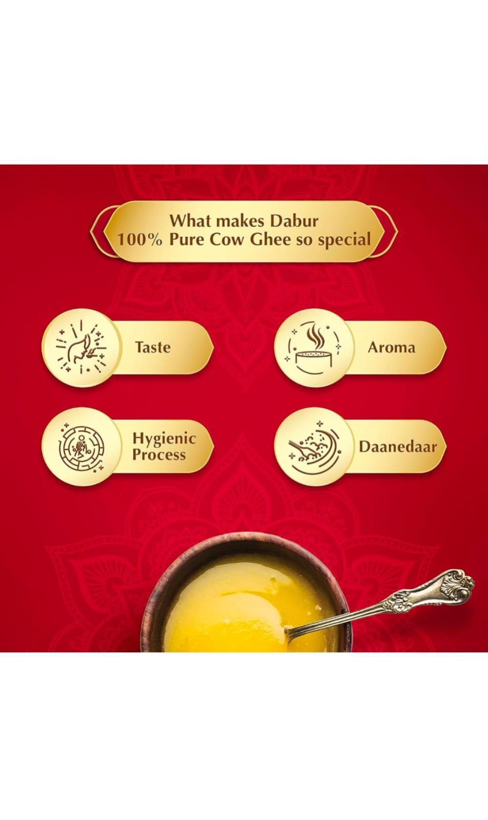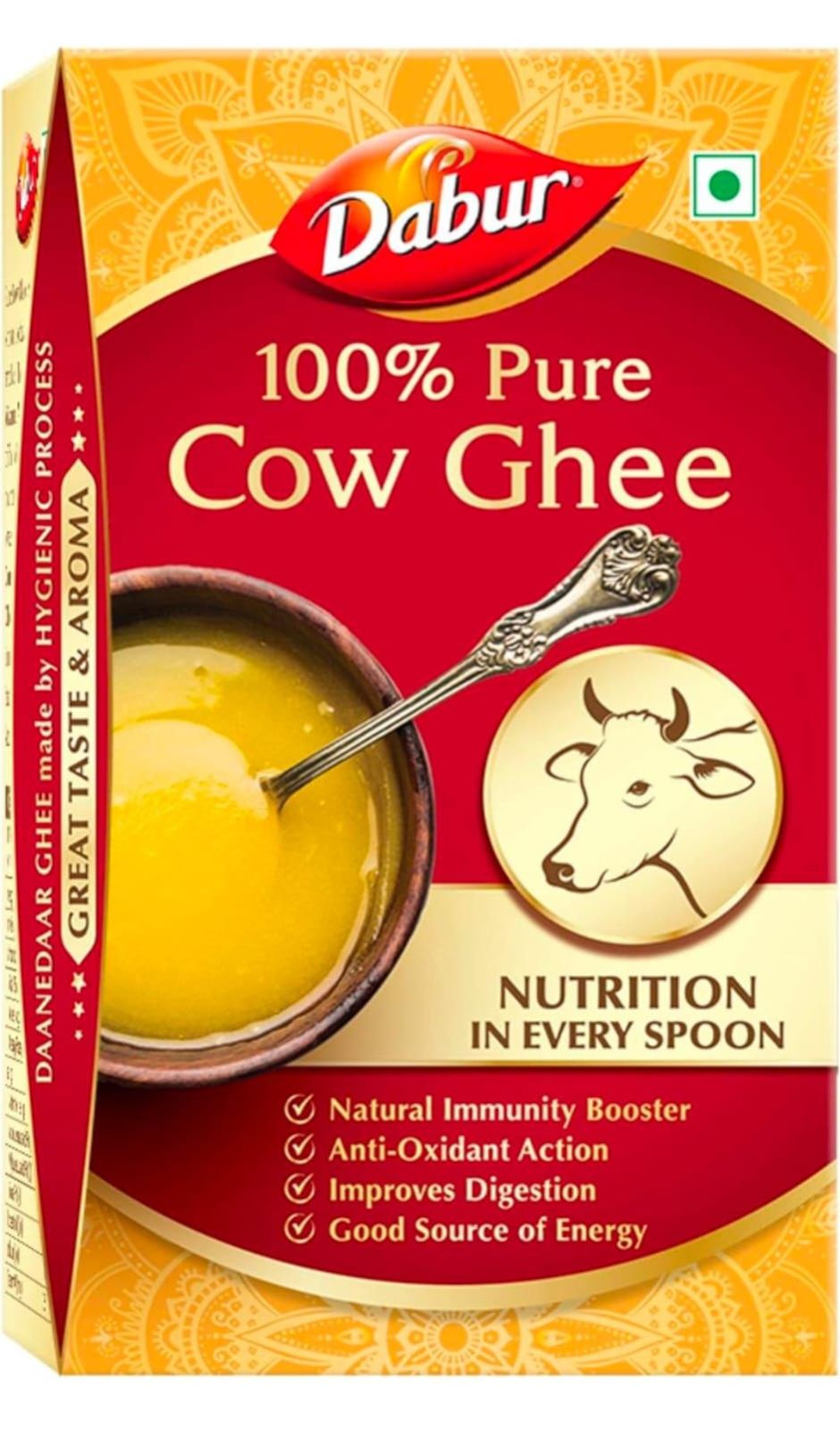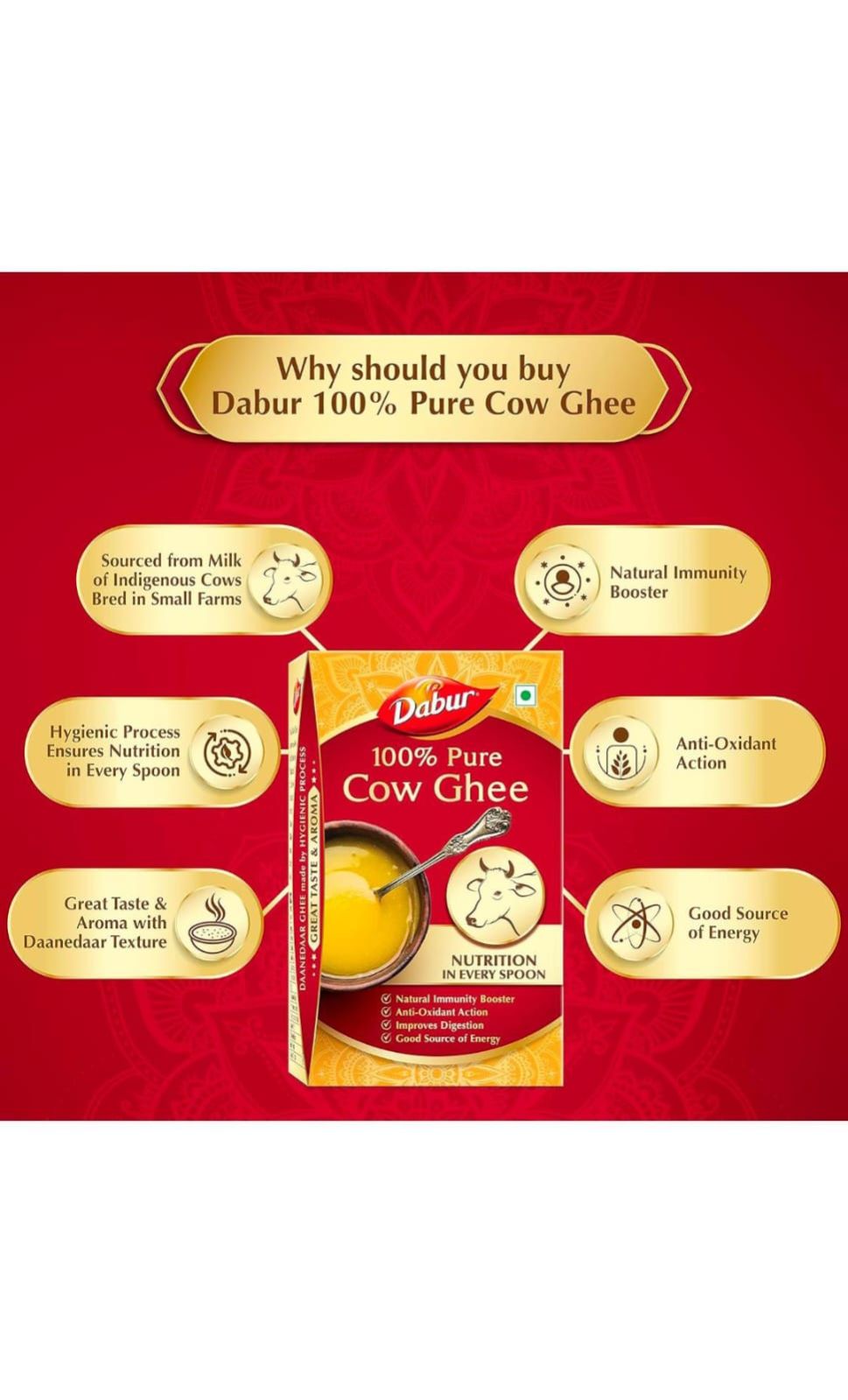 Dabur 100% Pure Cow Ghee is sourced from milk of indigenous cows bred in small farms and is made by following a hygienic process and has great taste and Aroma . Pure Cow Ghee is traditionally known to be a source of energy and has the goodness of Vitamin A and MUFA . It is a natural immunity booster and its antioxidant action helps fight cell damage .It consists of fat soluble vitamins and helps maintain healthy cholesterol levels ,and aids healthy weight. Consumption of Pure Cow Ghee helps to improve immunity , gastrointestinal health , strengthens bones and keeps your skin glowing .Add Dabur 100% Pure Cow Ghee every day to your roti’s , dal and paranthas for great taste.