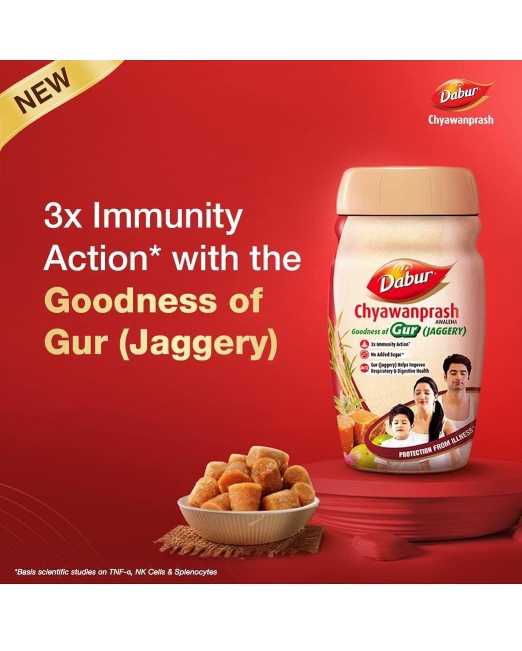 The all new Dabur Chyawanprash with the goodness of Gur (Jaggery) has 3X immunity action which helps strengthen immunity