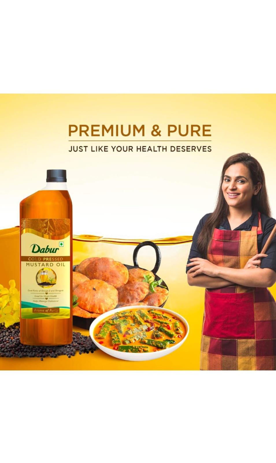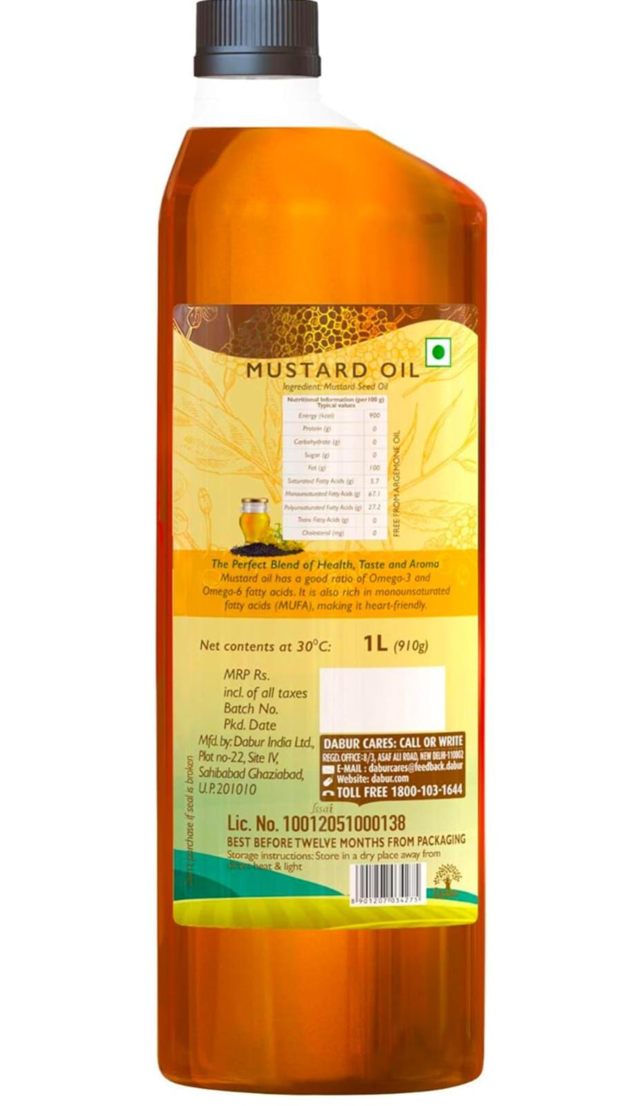 It is traditionally cold pressed from finest quality mustard seeds, ensuring that the natural properties and health benefits are intact. It contains the good ratio of omega -3 and omega - 6 fatty acid. Daily consumption of DABUR cold pressed mustard oil gives way to healthy lifestyle.It is rich in monosaturated fatty acid making it good for heart and it also helps in managing cholesterol and improve blood circulation. Cooking with DABUR mustard oil gives a delicious twist to your dish with great flavour and aroma.