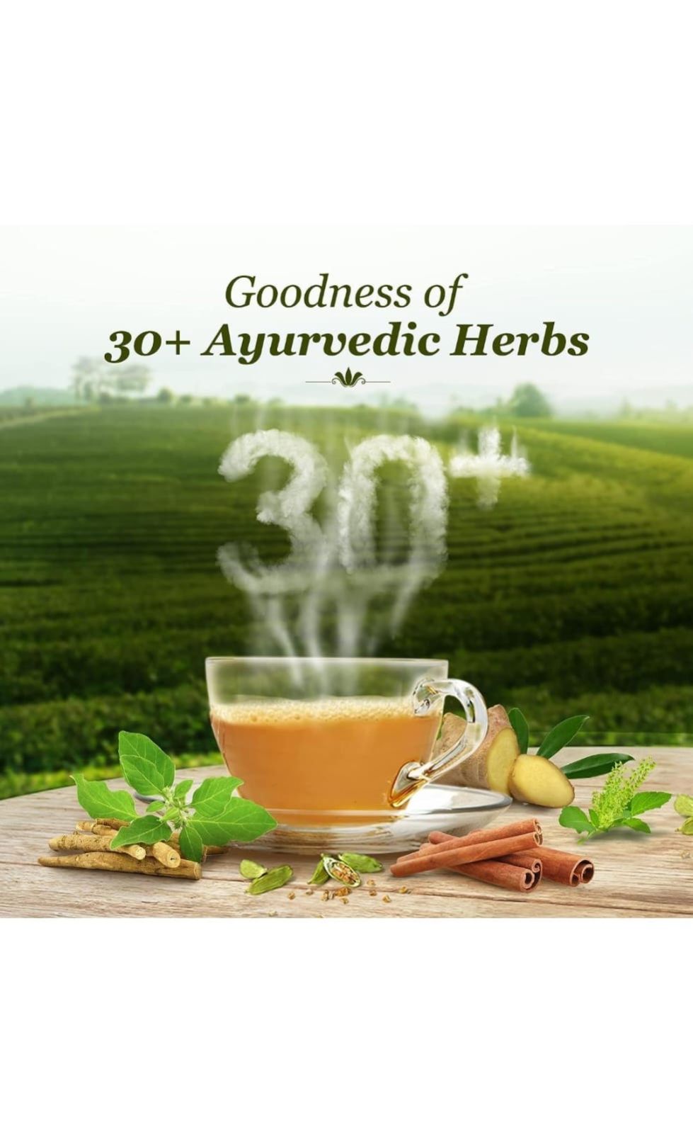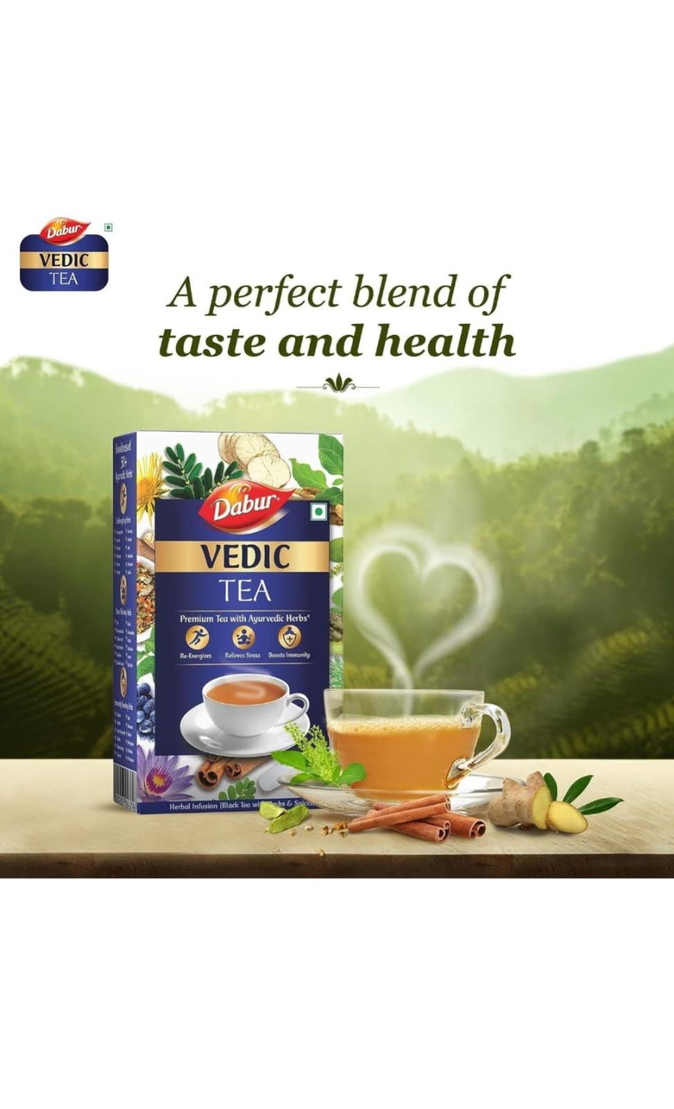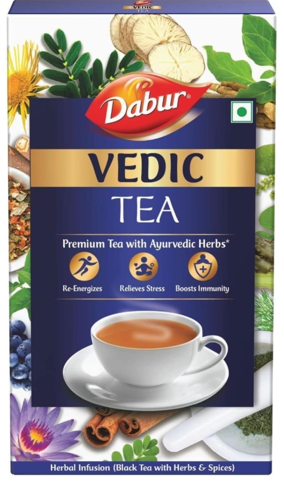 Experience the goodness of Dabur Vedic Tea - a Premium Black Tea/Chai enriched with 30+ Ayurvedic Herbs, handpicked from Assam, Nilgiri & Darjeeling. Revel in the blend's Rich Taste and Soulful Aroma, offering the perfect harmony of flavors in every sip of chai. Unleash its 3-way benefits - Re-Energizes, Relieves Stress & Boosts Immunity - a true elixir for well-being. Crafted with 130+ years of Ayurvedic expertise, each cup embodies ancient healing wisdom. Embrace this revitalizing chai experience, feeling refreshed, rejuvenated, and invigorated with every aromatic cup of chai/tea wellness.