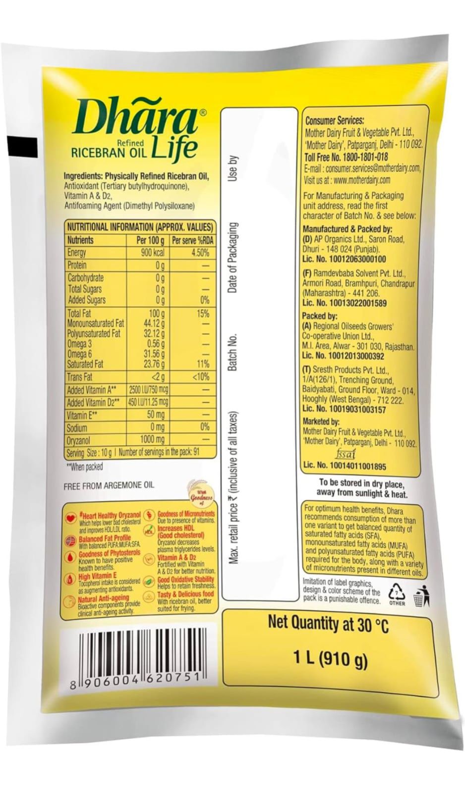 Dhara Life Refined Ricebran Oil Pouch, 1L