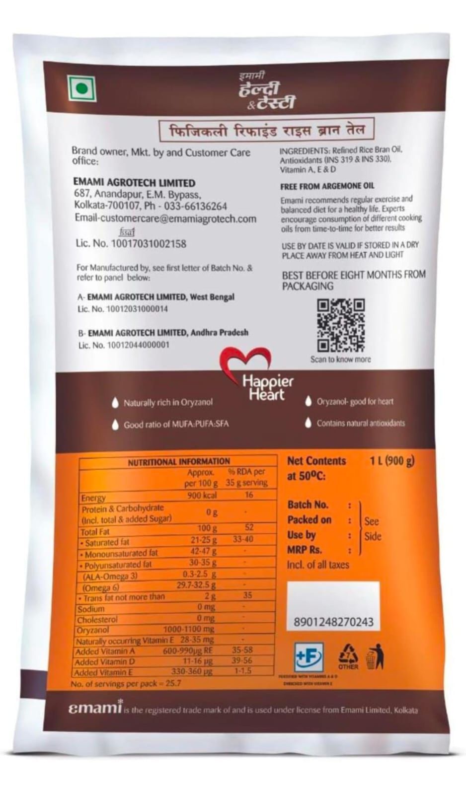 Emami Healthy and Tasty Refined Rice Bran Oil Pouch, 1L | Profit and Grocery