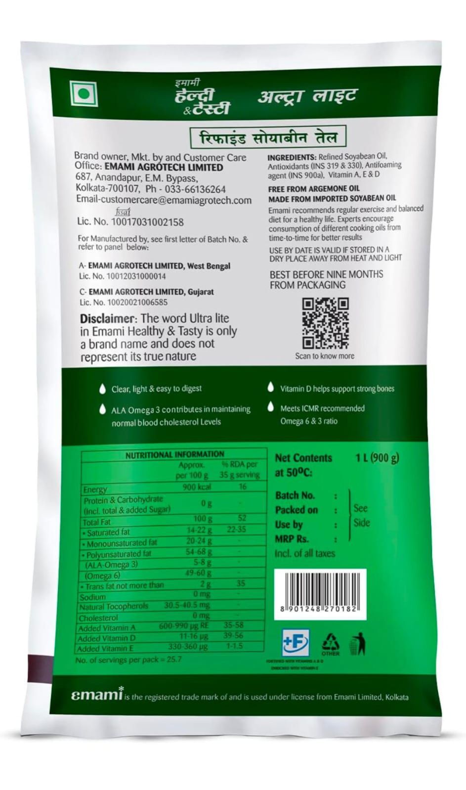 Emami Healthy & Tasty Ultra Lite Refined Soyabean Oil with Omega 3, Vitamin A, D & E, Light in colour & Healthy Cooking Oil, good for frying, baking, roasting, & sautéing, 1L Pouch