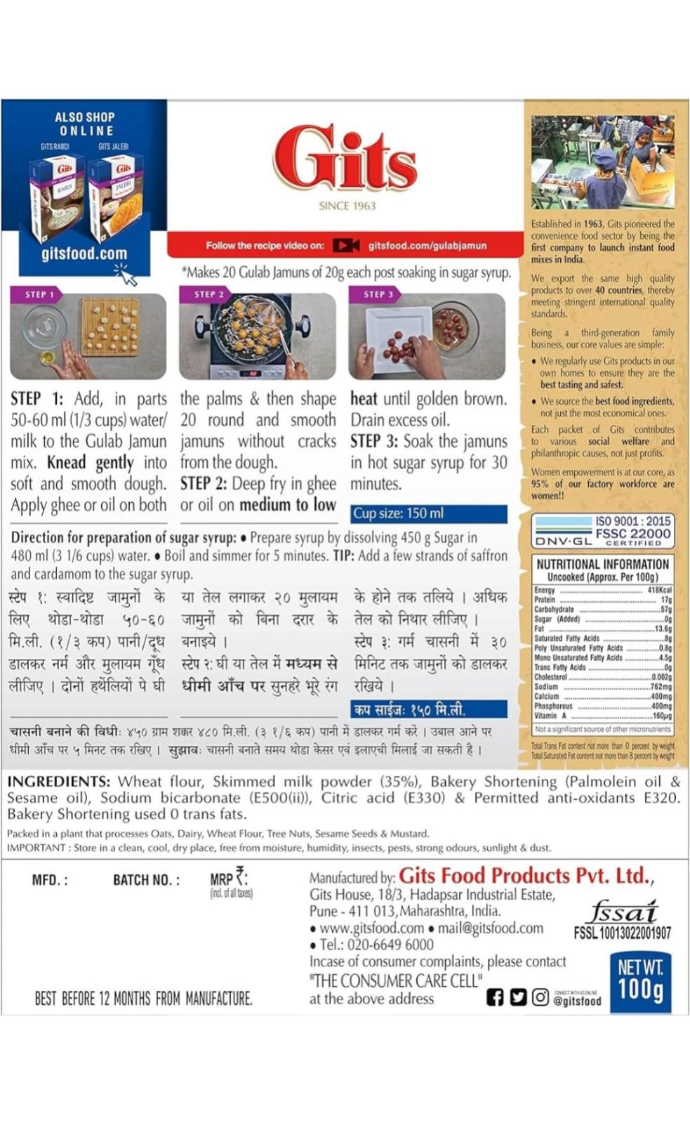 This Gits Instant Gulab Jamun Dessert mix is formulated using the best recipes to make sure that you end up with soft and juicy Gulab Jamuns that melt in your mouth. The 100-gram pack of this Gulab Jamun mix can provide up to 20 delicious Gulab Jamuns for a big family gathering. For best results, it is recommended that the instant mix powder be mixed with water, made into a soft dough, fried in pure ghee and soaked in sugar or sweet syrup for at least 30 minutes. Since this is a 100% vegetarian, preservative-free, and artificial colours and flavor-free mix, it is a great addition to your kitchen for unexpected guests and special occasions. Add some vanilla ice cream to a bowl of Gulab Jamuns and feel the wonderful combo of flavours. Gits dessert ready mixes are made using the finest ingredients, and with the suggested recipes, you can make fantastic homemade Indian mithais. A 3-generation family-owned business, Gits can help you make perfect, delicious and flavour-filled Indian sweets and savouries.