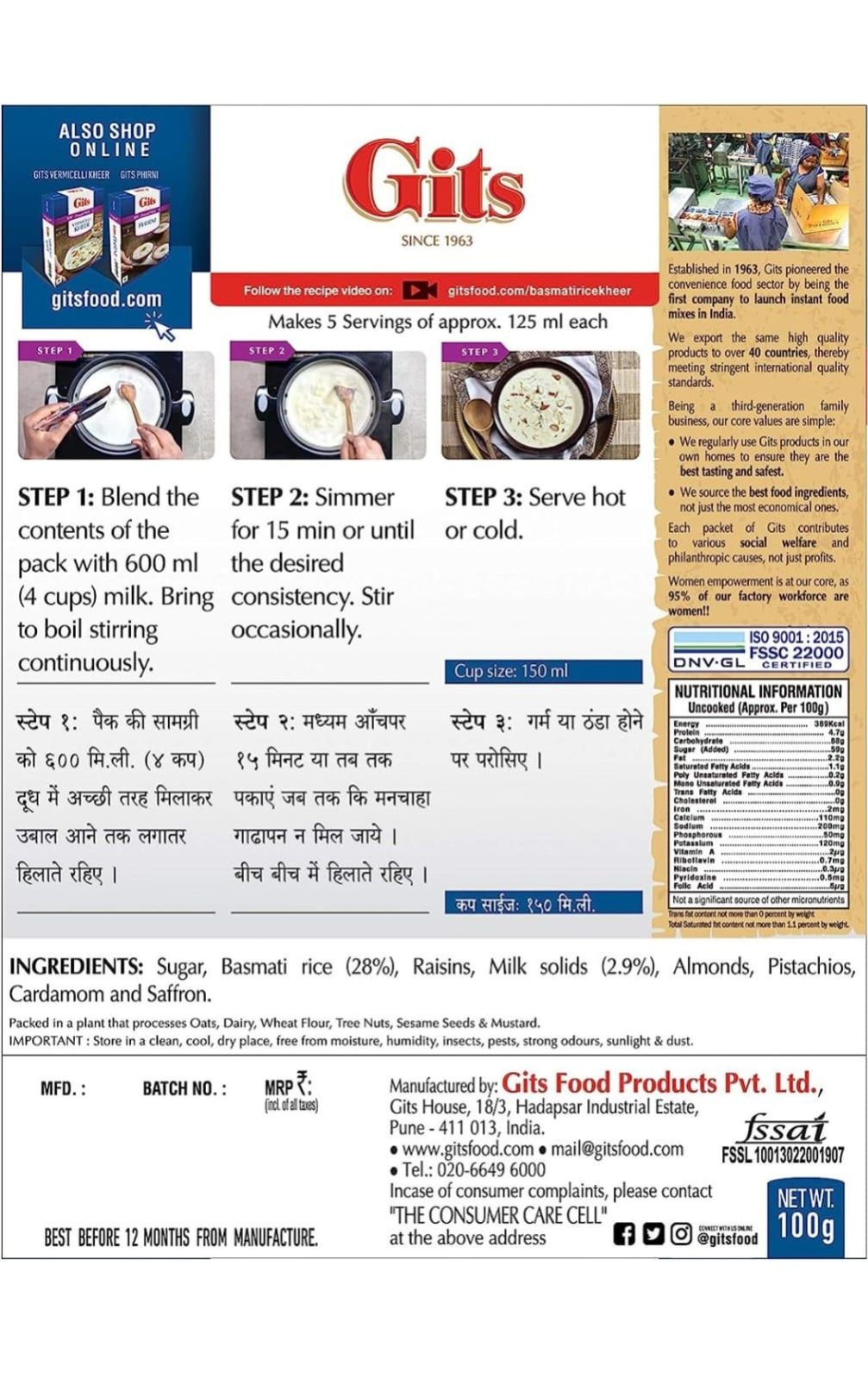 Gits Instant Rice Kheer Dessert Mix, Pure Veg, Indian Sweet and Dessert Ready Mix 100g 13% off | Profit and Grocery