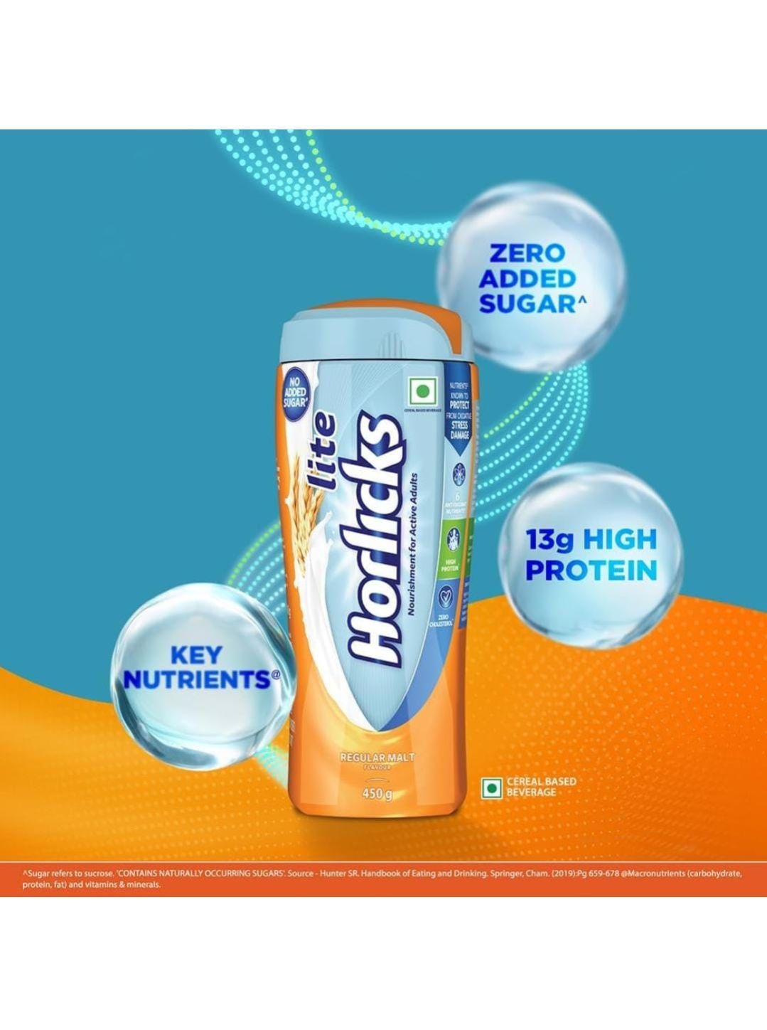 Horlicks Lite Regular Malt Health & Nutrition Drink for Adults, 450g Jar | High Protein Adult Health Drink for Immunity, No Added Sugar