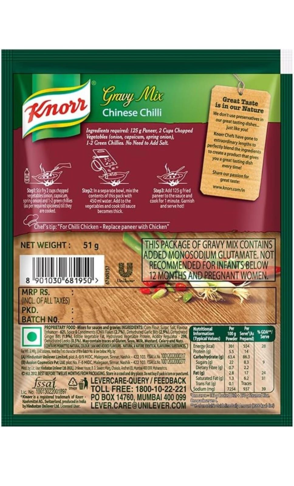 Just like you, we love everything about food, because no delicious meal is cooked without love. Love for carefully selected ingredients, flavours, the aroma of dinner wafting through your home, love of serving people who matter the most to you. With Knorr as your cooking partner, you can serve your loved ones nutritious and flavourful meals at home. Made with top quality ingredients such as soya, green chillies and garlic, Knorr Chinese chilli gravy mix packs a real spicy punch. Knorr has four interesting Chinese ready to cook variants –Chinese chilli, Manchurian, schezuan gravy mixes and fried rice/noodles instant mix. Great taste is in our nature! Now make restaurant-like Chinese at home with Knorr Chinese easy to cook in just 3 steps. Make in 3 easy steps: stir fry 2 cups chopped vegetables and 1 to 2 green chillies till they are cooked in a separate bowl, mix the contents of this pack with 450 ml water. Add vegetables and cook till sauce becomes thick. Add 125 g fried paneer to the sauce and cook for 1 min. Garnish and serve hot!