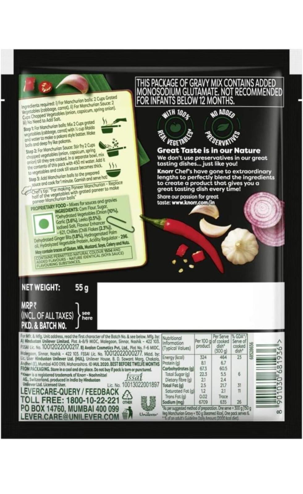 Just like you, we love everything about food, because no delicious meal is cooked without love. Love for carefully selected ingredients, flavours, love of serving people who matter the most to you. With Knorr as your cooking partner, you can serve your loved ones nutritious and flavourful meals at home. Infused with generous quantities of ginger, garlic and soy sauce, Knorr Chinese Manchurian Gravy Mix offers the perfect amalgam of Chinese and Indian elements to provide you a unique taste. Knorr has four interesting Chinese Ready To Cook variants –Chinese Manchurian, Chilli, Schezuan gravy mixes and Fried Rice/Noodles instant mix. Great taste is in our nature! Now make Restaurant-like Chinese at home with Knorr Chinese Easy to Cook in just 3 steps. Make in 3 Easy Steps: Prepare manchurian balls (Mix 2 cups grated vegetables with 1/2 Maida in water to make pakora style batter, make balls & deep fry like pakoras) Stir fry 2 cups chopped vegetables till they are cooked In a separate bowl, mix the contents of this pack with 450 ml water. Add it to the vegetables & cook till sauce becomes thick. Add Manchurian balls to the prepared sauce & cook for 1 min. Serve hot!