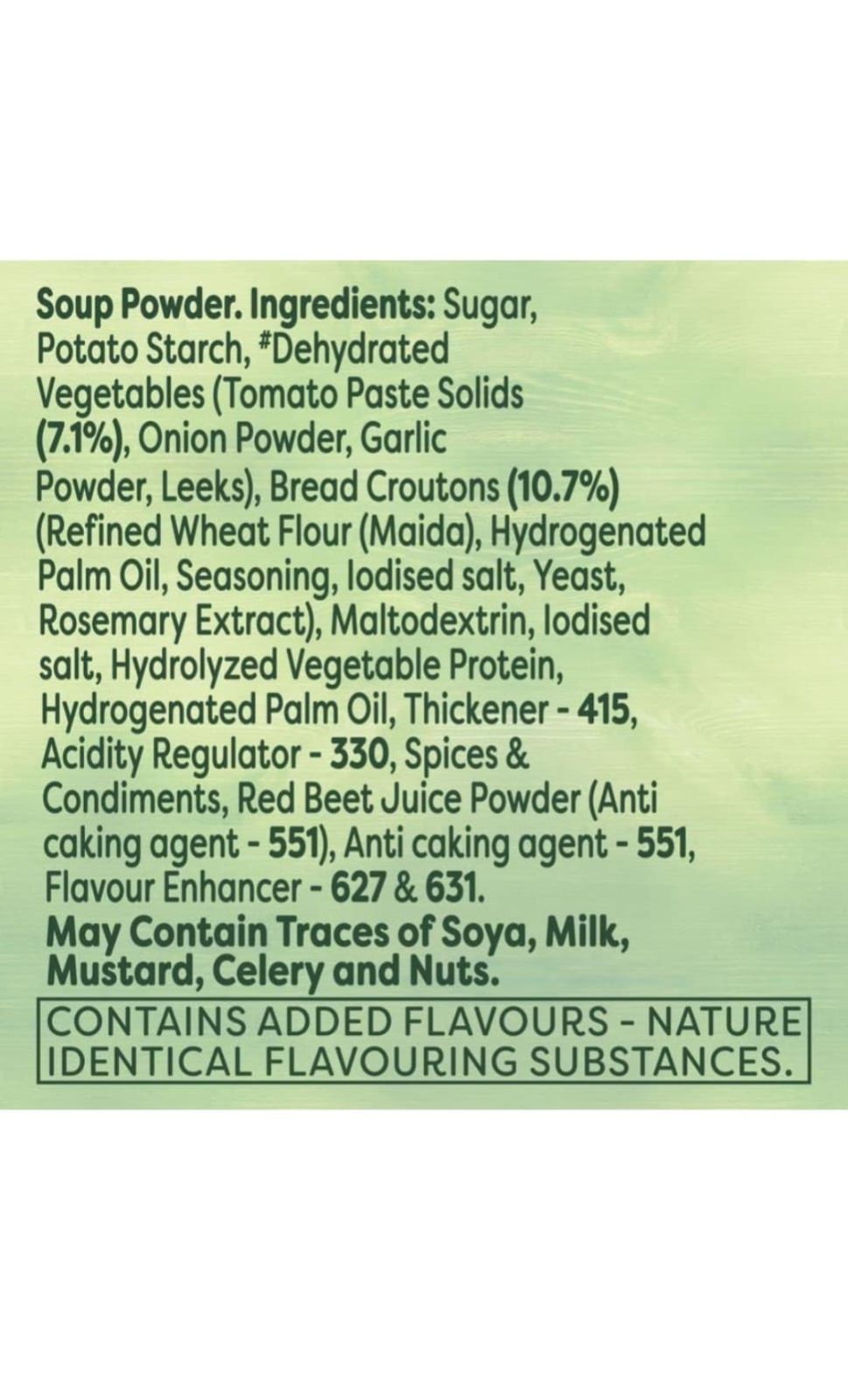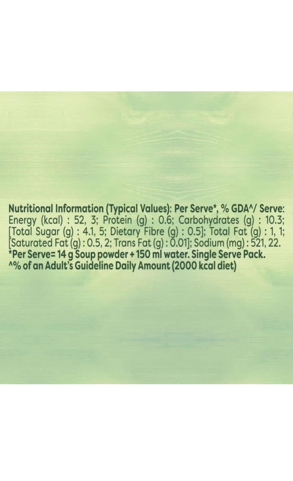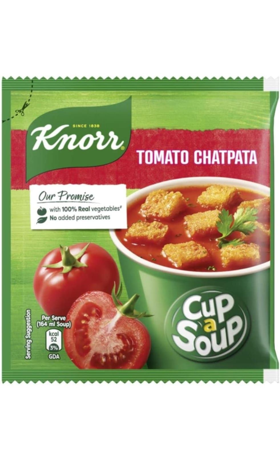 Knorr Tomato Chatpata Cup-A-Soup is the perfect combination of tomato with sour, sweet, salty, and spicy flavours making this cup-a-soup an instant hit. Knorr Tomato Chatpata Cup-A-Soup satisfies your small hunger pangs in just 1 minute. It's crunchy, delicious and easy to make everytime. Made with 100% real vegetables and no added preservatives, this soup is ready in three simple steps. So now enjoy Restaurant like delicious Soup at home.Knorr Soups range comprises of 11 delicious flavours of 4 serve soups and 7 flavours of Cup-a-soup. Great taste is in our Nature! Knorr has gone to great lengths to ensure a perfect blend of ingredients and consistency that give you Restaurant like Soup at home.About Knorr:Just like you, we love everything about food, because no delicious meal is cooked without love. Love for carefully selected ingredients, flavours and spices, or the aroma of dinner wafting through your home. Love for the people you feed everyday; your family and friends, relatives and guests, the people that matter to you the most. With Knorr as your cooking partner, you can serve your loved ones nutritious and flavourful meals at home. Soup Fun Fact - Soup isn’t always served hot. In warmer climates like Spain, cold soup alternatives, like tomato-based gazpacho, are popular.