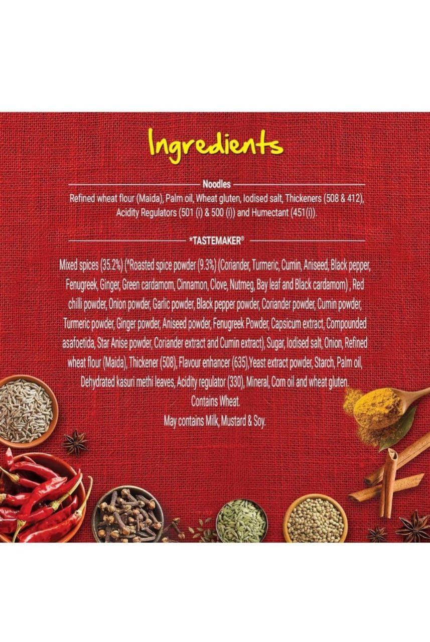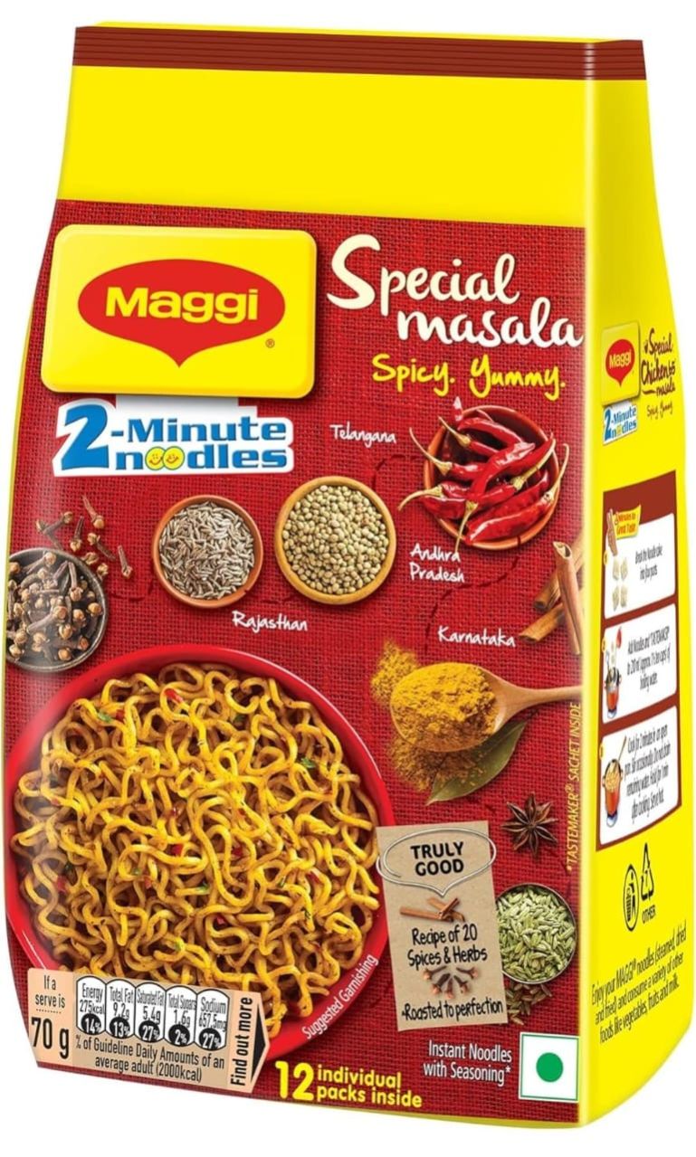 Nestle MAGGI 2-minutes masala noodles have been a classic indian snack since more than a decade. To take your favourite masala taste experience to the next level, MAGGI introduces the new MAGGI special masala noodles, a recipe of 20 spices and herbs that provides a more redefined MAGGI masala experience. Made with a blend of finely ground and whole spices, and herbs, the all new MAGGI instant noodles have an extra special and flavourful tastemaker sachet inside. These spices have been roasted to perfection, providing a distinct aroma and colour to your MAGGI noodles. Usage : 1. Break the Noodle cake into four parts. 2. Add Noodles and TASTEMAKER to 210 ml (approx. 1 cup) of boiling water. 3. Cook for 2 minutes in an open pan. Stir occasionally. Do not drain remaining water. Hold for 1 min after cooking. Serve Hot. Storage instructions : Store in cool, dry & hygienic place.