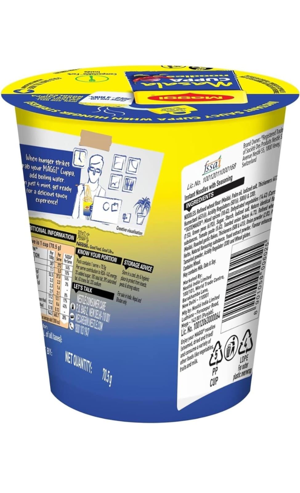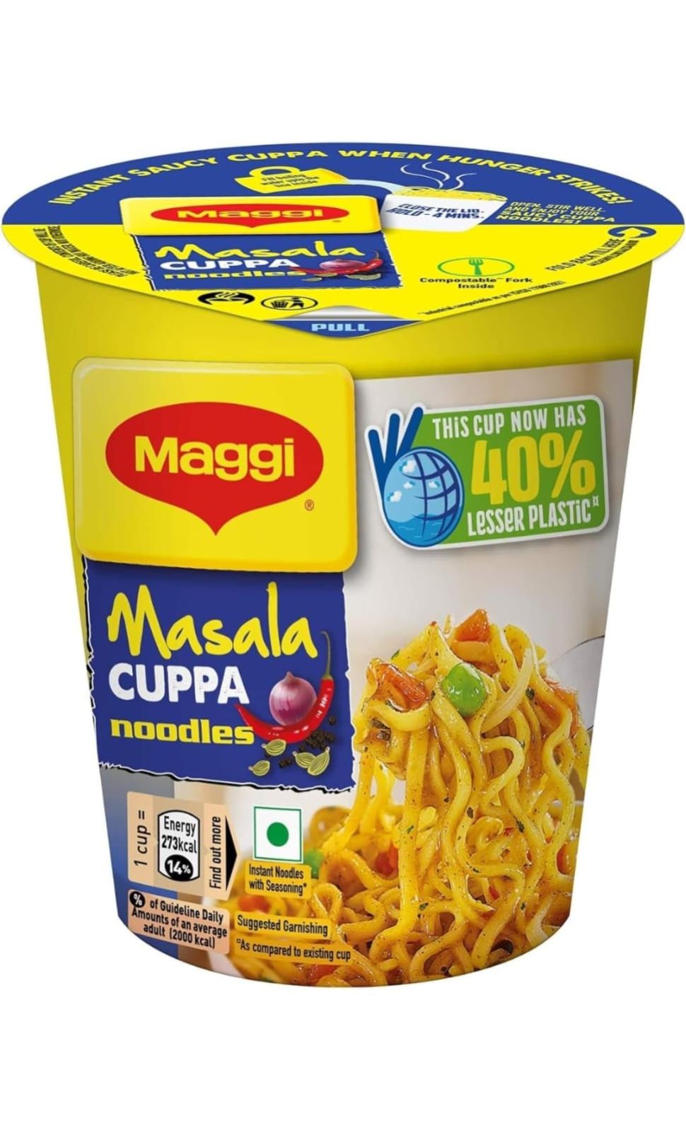 MAGGI Cuppa offers you the delicious taste of MAGGI combined with the convenience of cup noodles! It is an ideal offering for the new generation, pressed hard for time, trying to juggle multiple roles all at once & can be enjoyed anytime on the go. Containing your favourite masala taste, MAGGI cuppa noodles are made with the finest quality spices and ingredients. The thermoform cup comes with Tastemaker already added and a fork inside, for maximum convenience, even on the go. Usage: When hunger strikes grab your MAGGI Masala Cuppa, add boiling water. In just 4 mins, get ready for a delicious saucy experience!