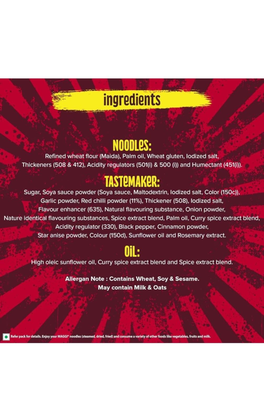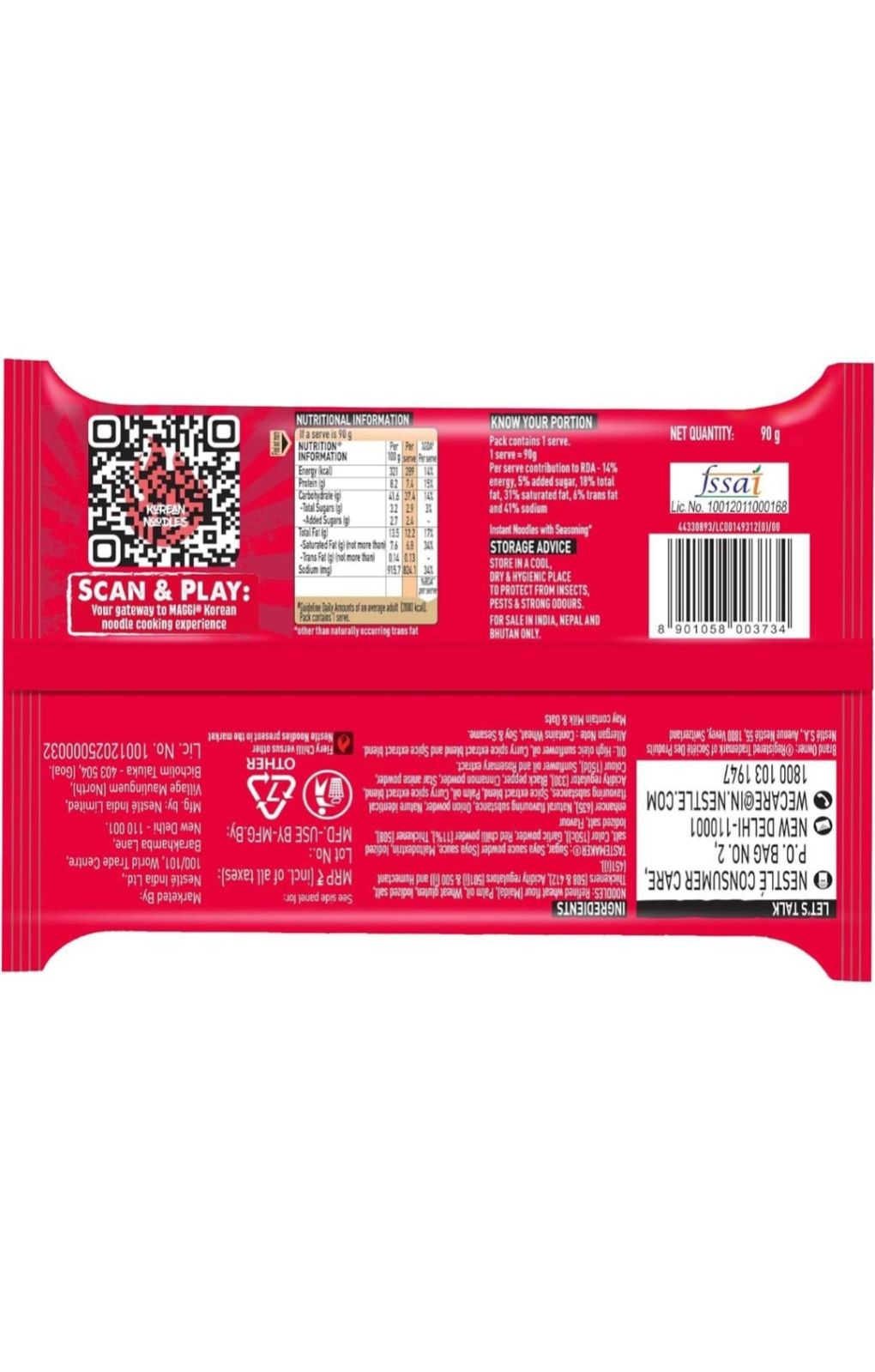 A fiery bowl of flavour that truly packs a punch! Big fan of spicy noodles and looking for something delicious for your taste buds? Well, look no further! India’s favourite brand MAGGI is finally here with the long-awaited Korean noodles! Indulge in a spicy affair with this instant noodles where Korean barbeque meets fiery chilli that truly hits the spot! MAGGI Korean BBQ veg noodles offer an irresistible fusion of world-famous Korean flavours and the classic MAGGI twist. These instant noodles are perfect for your go-to snack when craving something hot, delicious, and quick. So, grab your chopsticks and enjoy this fiery bowl of delicious ramyeon anytime! How to Cook: Add noodles to 400 ml (approx. 2 cups) of boiling water and cook for 3 mins in an open pan. Drain out the water. Add seasoning mix and seasoning oil. Mix well. Add your favorite toppings to make the perfect Ramyeon & serve! Storage Instructions: Store in a cool, dry, hygienic place to protect from insects, pests & strong odours.