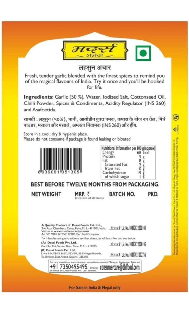 Mothers Recipe Garlic Pickle Pouch, 200 g