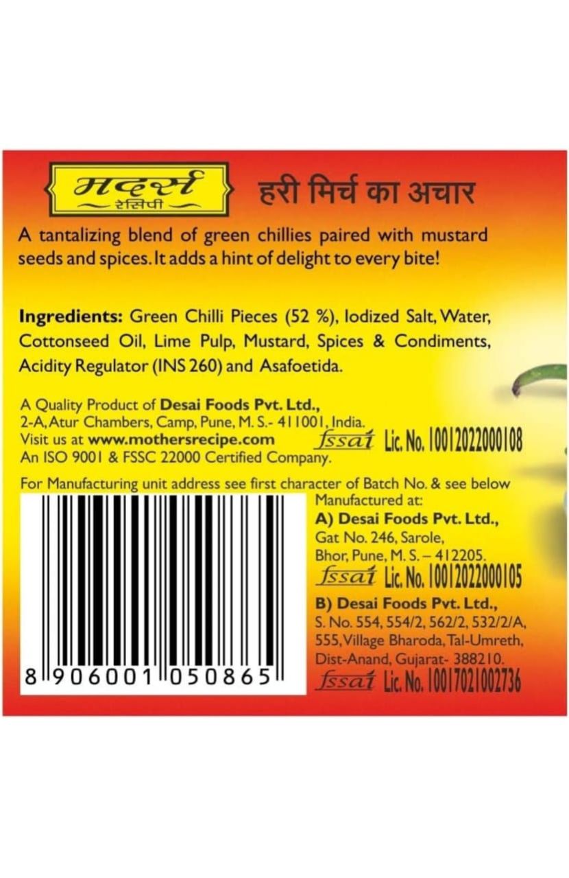 Mothers Recipe Green Chilli Pickle Bottle, 400 g | Profit and Grocery