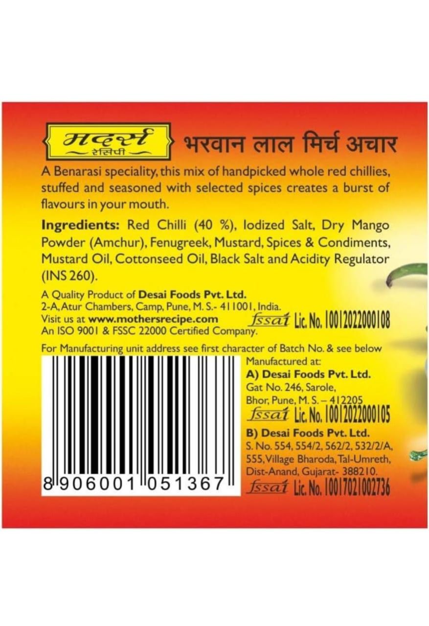 Mothers Recipe Stuffed Red Chilli Pickle Bottle, 400 g Amazon's Choice for "red stuffed chilli pickle" | Profit and Grocery