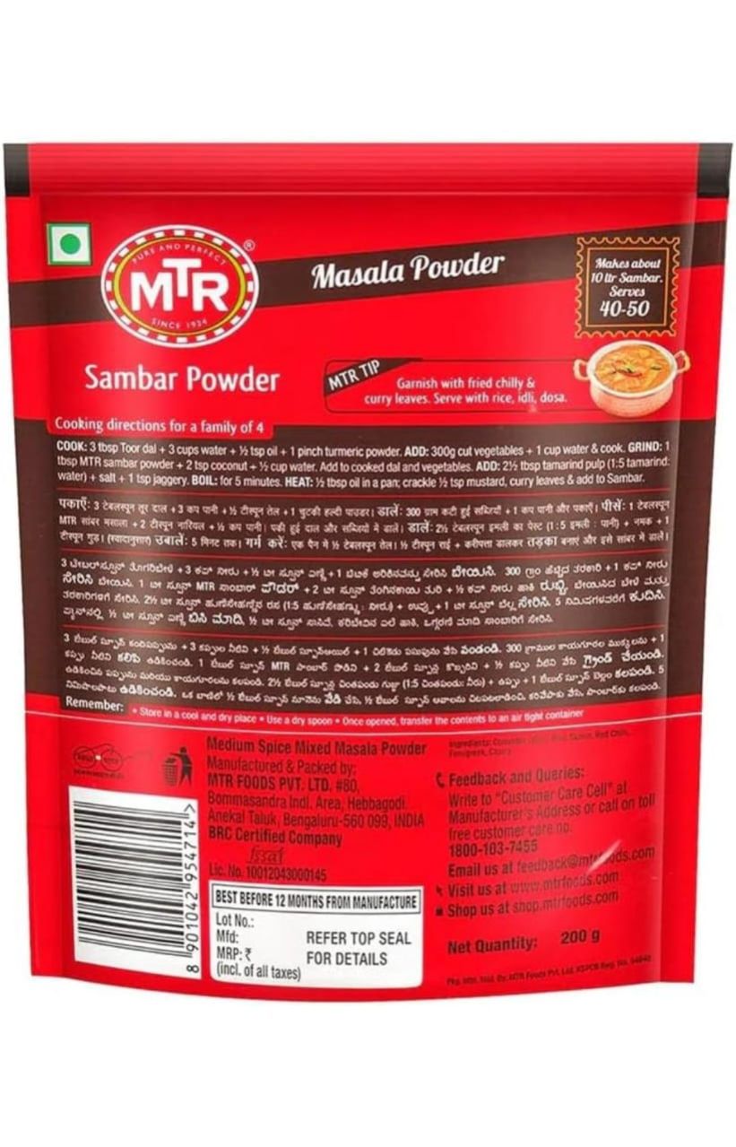 MTR Sambar Masala Powder,Authentic, mouth watering South Indian rasam, 200 G,Pack of 1