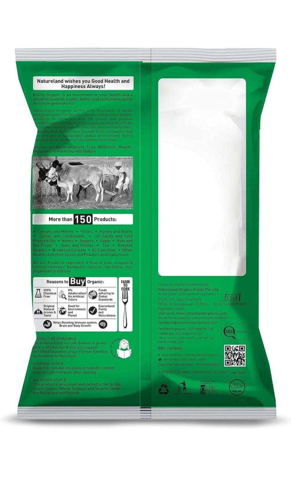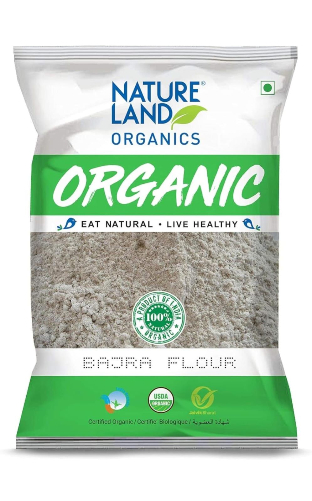 Bajra is rich in insoluble fibre that aids digestion. It also reduces secretion of bile acids and is linked to a lowered risk of gallstone formation. Natureland Organic foods bajra flour is processed from selected grains of best quality, processed and cleaned, free from chaff, broken, immature and foreign matters, wholesome and uniform in size and color, free from obnoxious smell, discoloration, immature, shriveled and all other impurities.