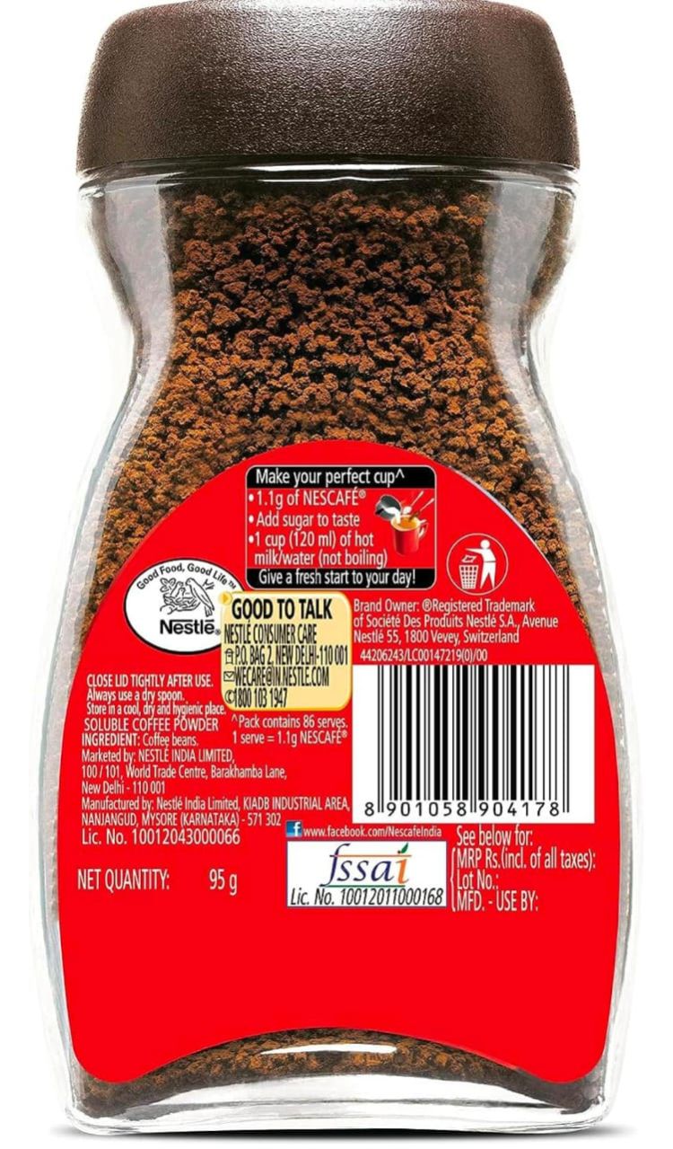 NESCAFE, world’s favourite instant coffee brand, brings to you rich and aromatic coffee in the form of NESCAFE Classic Instant Coffee, that will take your coffee experiences to the next level. The unmistakable flavour of NESCAFE Classic is what makes this signature coffee so loved all over the world. Start your day right with the first sip of this 100% pure coffee and let the bold taste and rich aroma of NESCAFE Classic Instant Coffee awaken your senses to new opportunities. With over 75 years of experience & working with coffee farmers to help them grow more sustainable coffee through improved crop techniques, we deliver fresh coffee beans produced by the best selecting, roasting and blending methods. Usage: Follow the instructions on the back of the pack and mix the coffee powder with hot or cold milk to get your instant coffee at home. Storage Recommendation: Store the product in a cool, dry and hygienic place. To ensure lasting freshness, close the lid tightly after every use. Always use a dry spoon. Gluten & Lactose-Free | Contains Caffeine