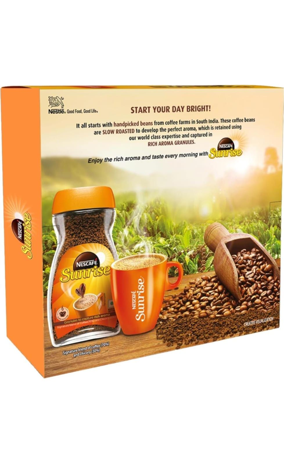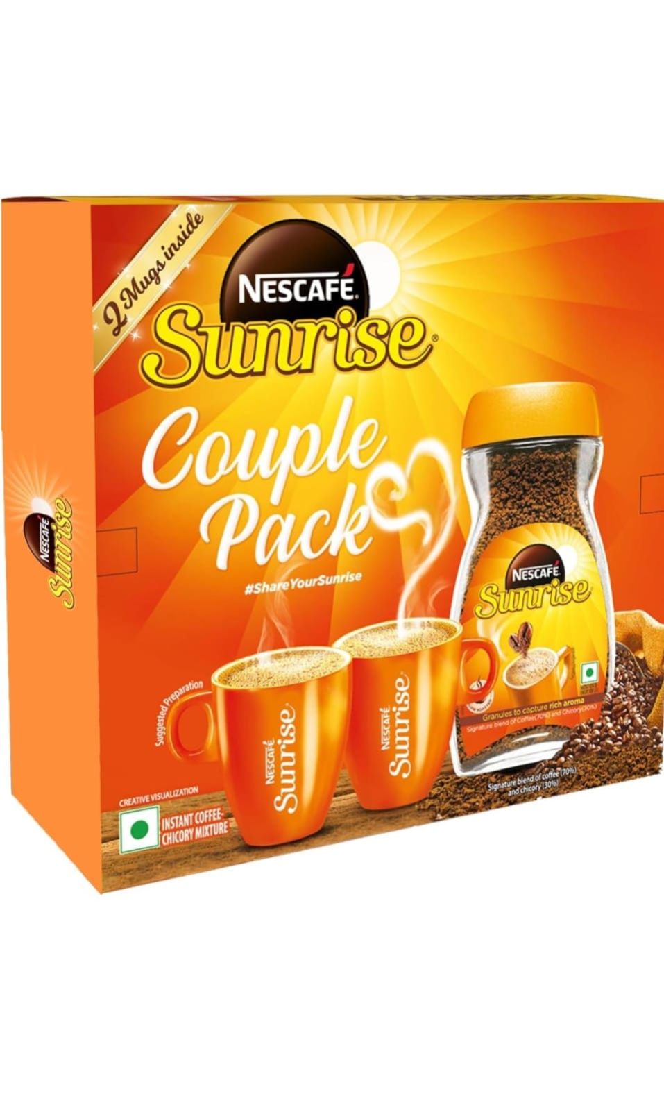 Start your day bright with NESCAFE SUNRISE! It all starts with handpicked beans from coffee farms in South India. These coffee beans are SLOW ROASTED to develop the perfect aroma, which is retained using our world-class expertise and captured in RICH AROMA GRANULES. This couple pack also contains two NESCAFE SUNRISE Orange coffee mugs for you and your better half to enjoy NESCAFE SUNRISE. Usage: Simply follow the instructions on the back of the pack and mix the coffee granules to hot water, sugar and milk to enjoy the great aroma and taste in every cup! Storage Information: On opening, transfer the contents of the pack into an airtight container. Always use a dry spoon.
