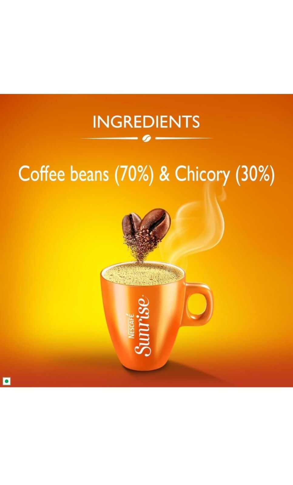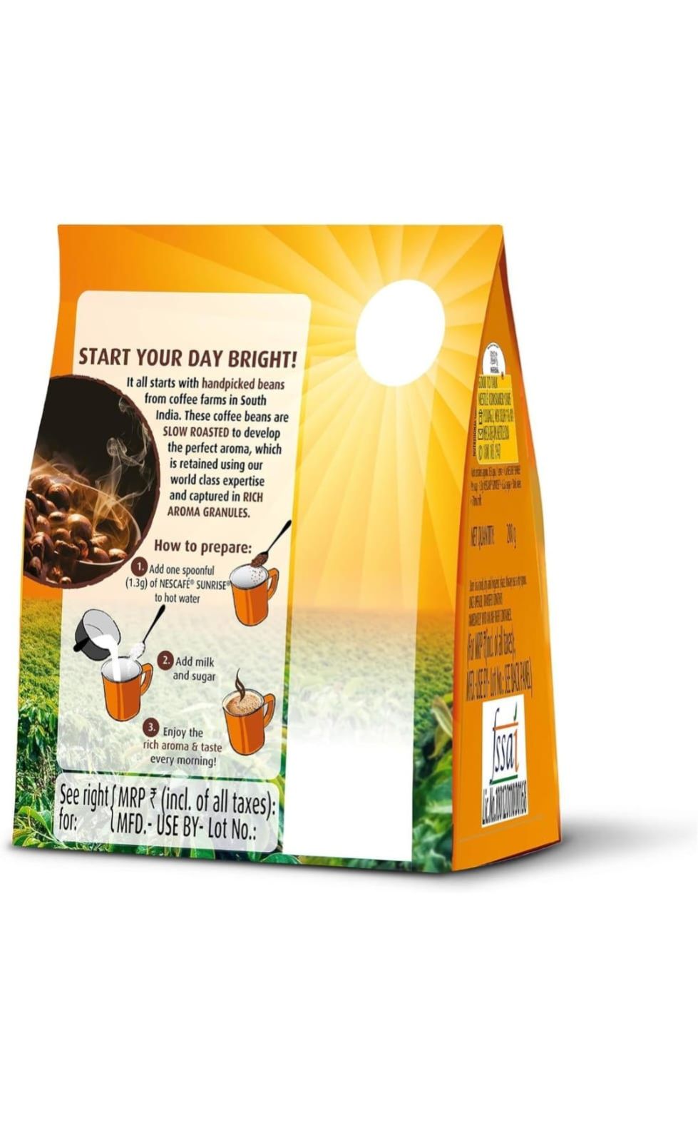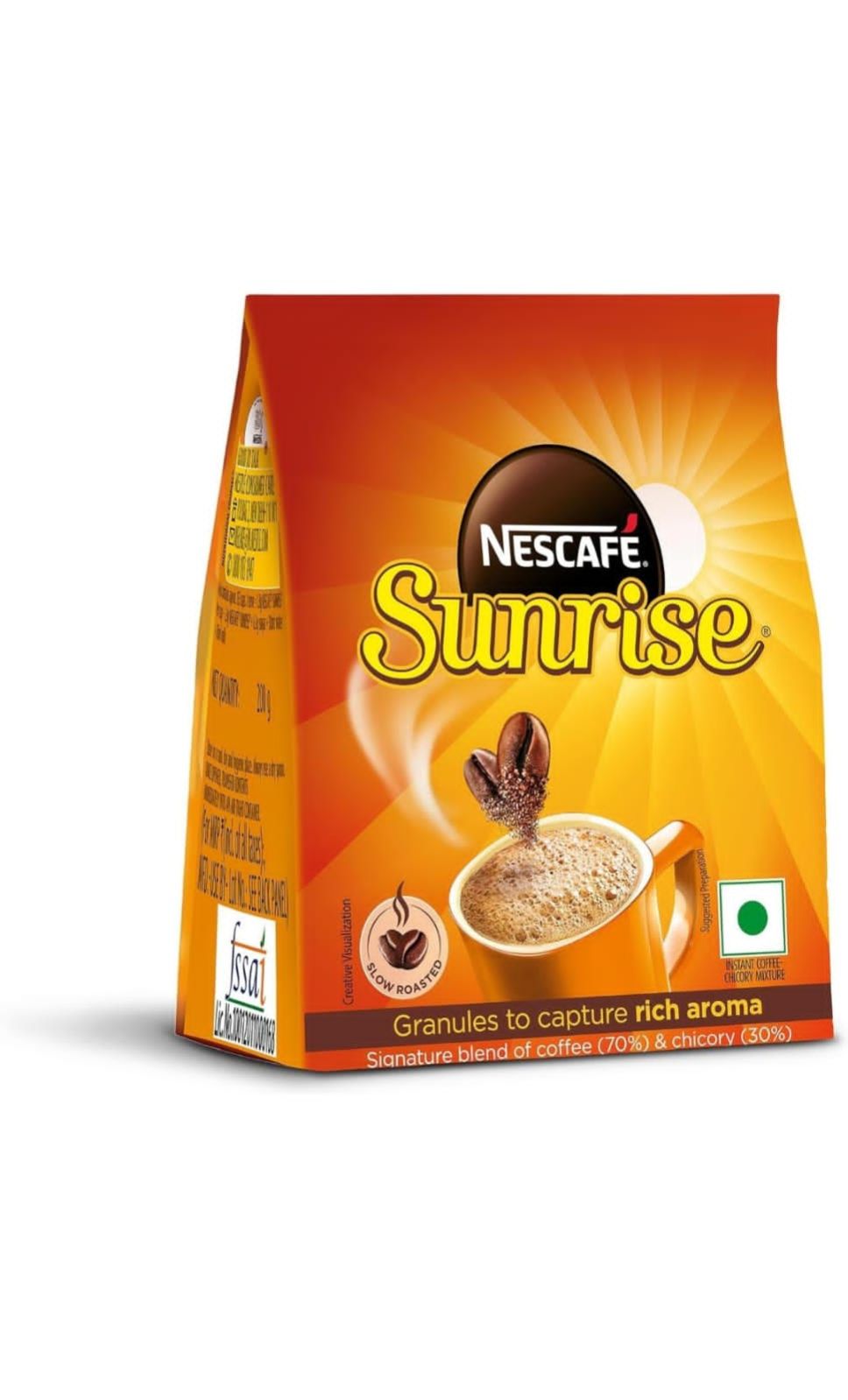 "Start your day bright with NESCAFE SUNRISE! It all starts with handpicked beans from coffee farms in South India. These coffee beans are SLOW ROASTED to develop the perfect aroma, which is retained using our world-class expertise and captured in RICH AROMA GRANULES. Enjoy the great aroma and taste in every cup with NESCAFE SUNRISE. Usage: Simply follow the instructions on the back of the pack and mix the coffee granules to hot water, sugar and milk to release the rich aroma in your cup every morning. Storage Information: On opening, transfer the contents of the pack into an airtight container. Always use a dry spoon. "