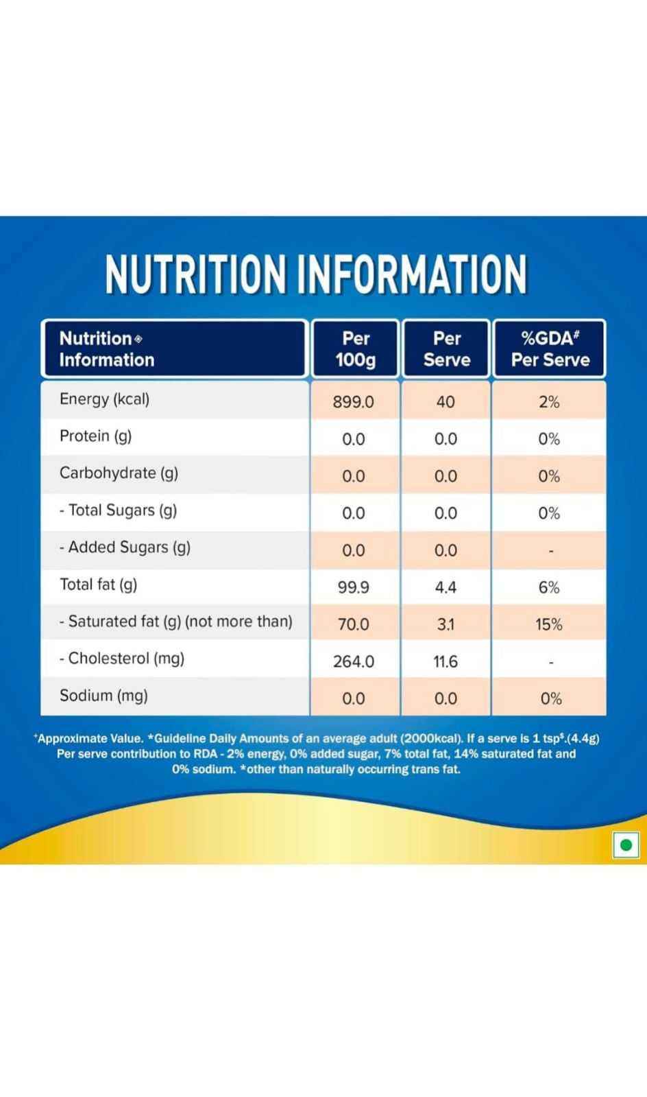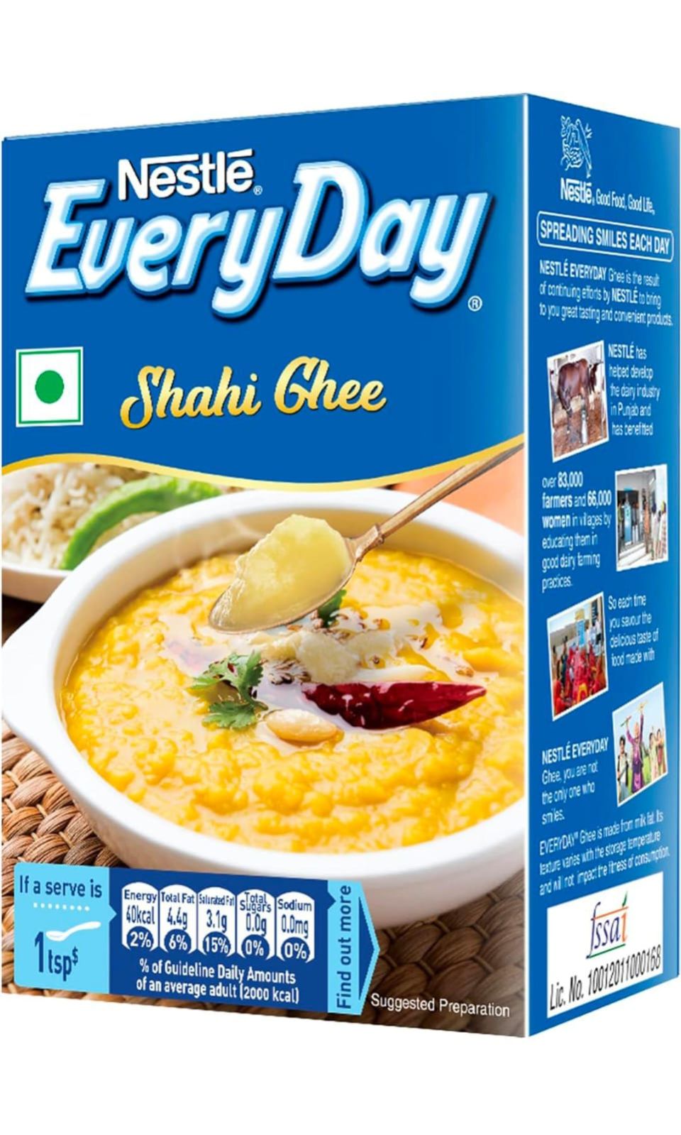 Nestlé EVERYDAY Punjab Ghee is the result of continuing efforts by Nestlé to bring to you great tasting and convenient dairy products. As a part of which, Nestlé has helped develop the dairy industry in Punjab and has benefitted over 1,00,000 farmers and 66,000 women in villages by educating them in good dairy farming practices. So, each time you savour the delicious taste of food made with nestle everyday ghee, you are not the only one who smiles. Moreover, Nestlé EVERYDAY Punjab Ghee, when consumed as a part of your daily balanced diet and active lifestyle, helps meet the body’s energy requirement through Fat. Nestle ghee is specially packaged to retain its flavour and aroma, so when used in preparations, it can also enhance the taste and flavour of food, making it a must have in all Indian households. Usage: Add Ghee directly in all types of cuisines. Storage Instructions: Store in a cool, dry and hygienic place. Safety Information: To ensure lasting freshness, close the pack tightly after every use.