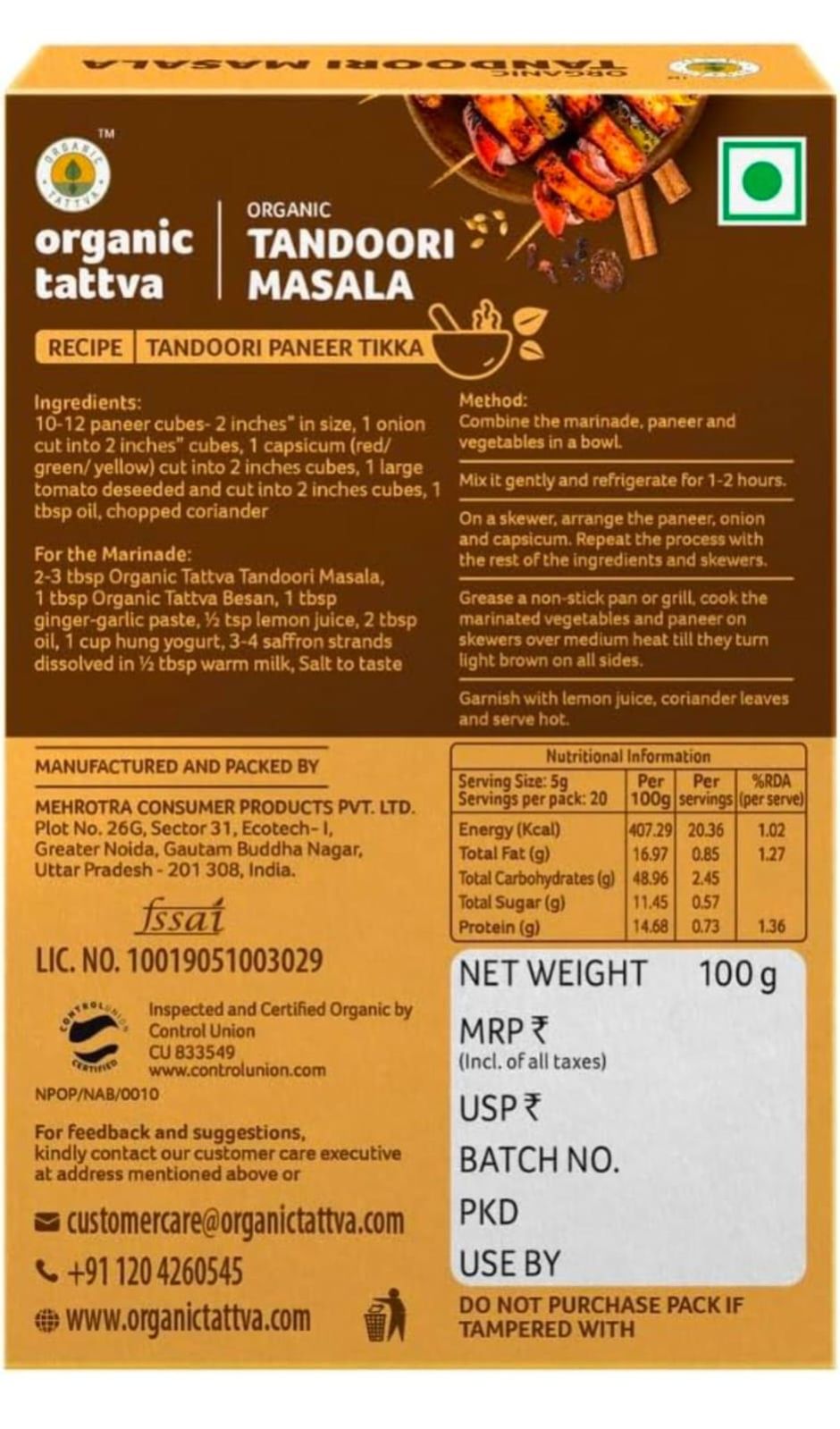 Organic Tattva, Organic Tandoori Masala Powder - 100 Gram | No Artificial Additives and NO Pesticides | Profit and Grocery