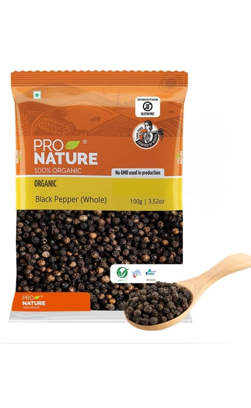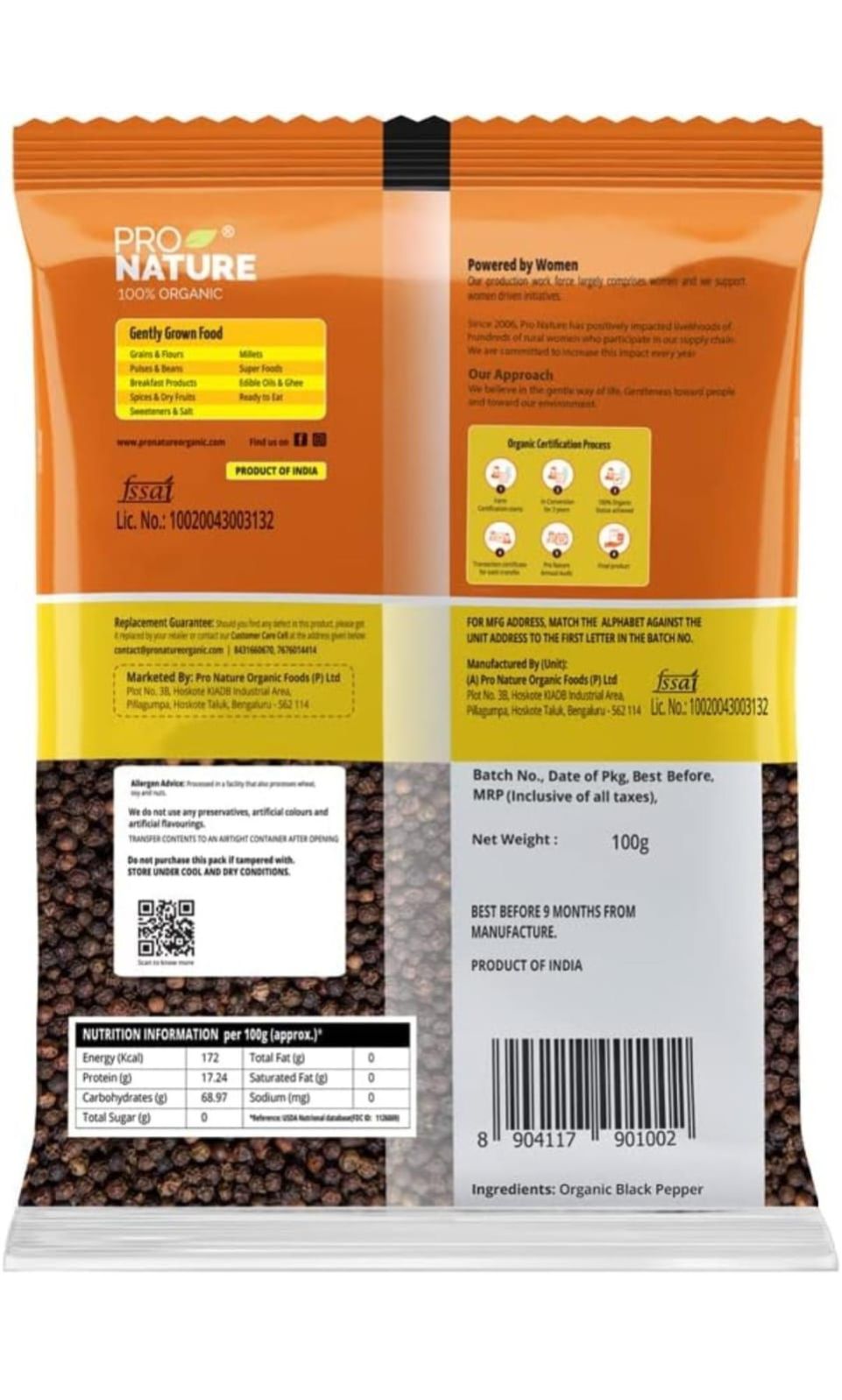 Pro Nature 100% Organic Black Pepper (Whole), 100g | Profit and Grocery