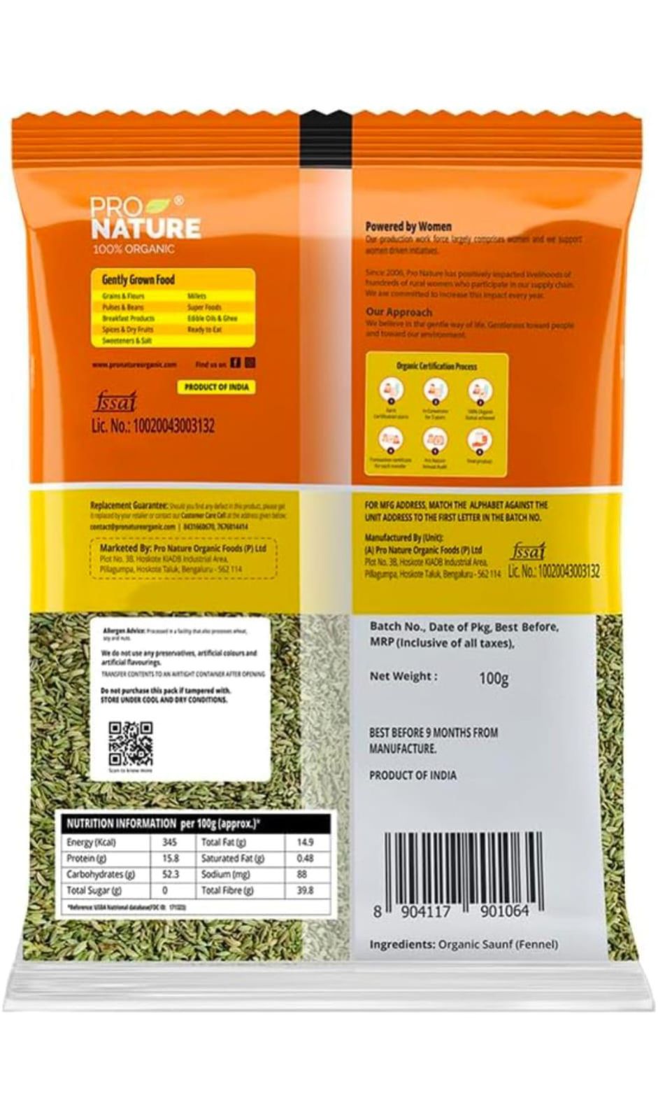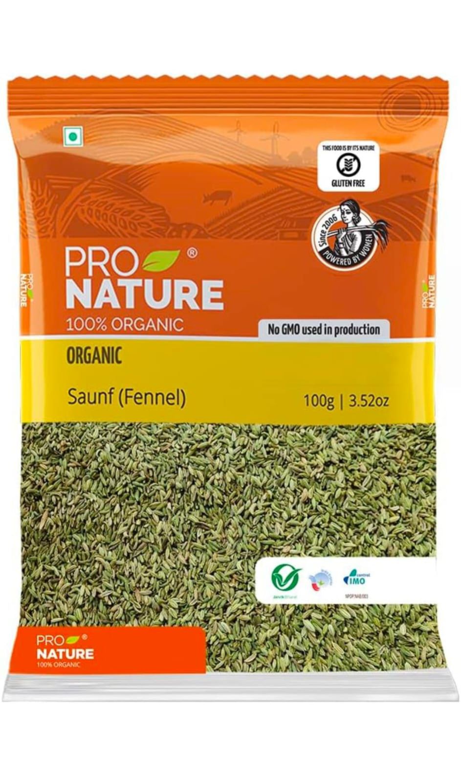 Pro Nature 100 per cent Organic Saunf or Fennel has an authentic pungent flavor and strong aroma, sourced from where it is best grown. It is rich in its anti-oxidant property and good for the digestive system, grown without any synthetic pesticides or chemicals. We take utmost care in packing and storing of all our products. Aromatic spice adds delightful, exotic flavor to a variety of dishes.