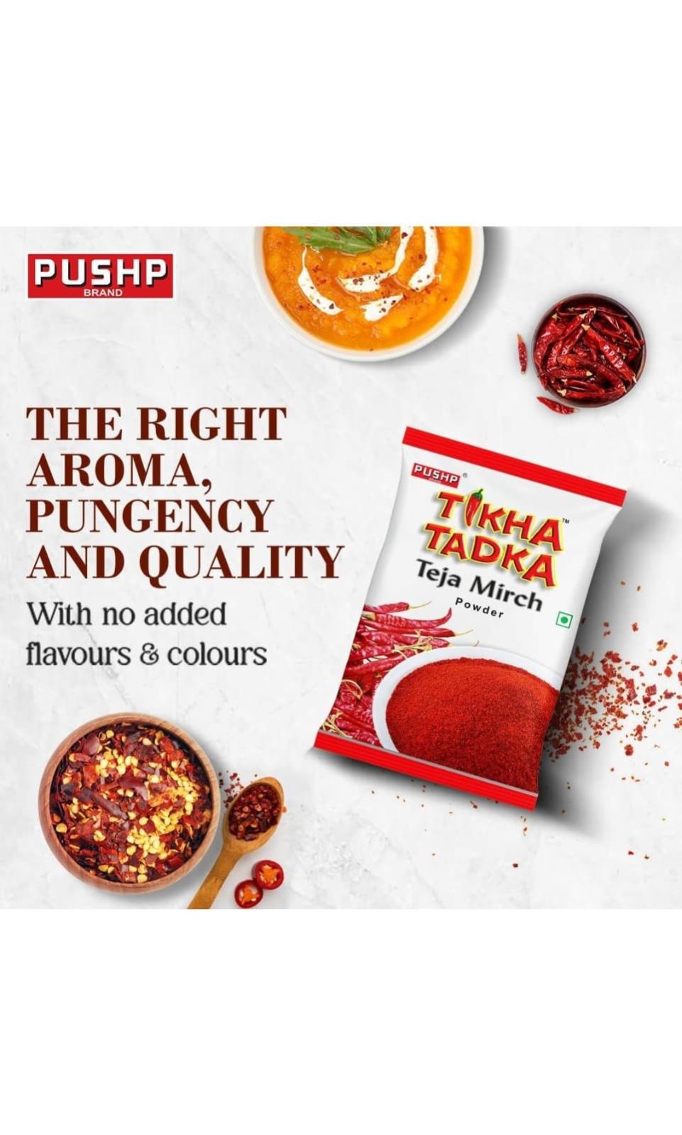 Pushp Kashmiri Mirch powder is a blend of medium spicy red pepper and is used predominantly in Tandoori preparations. It eliminates the need of adding any extra artificial color or flavors