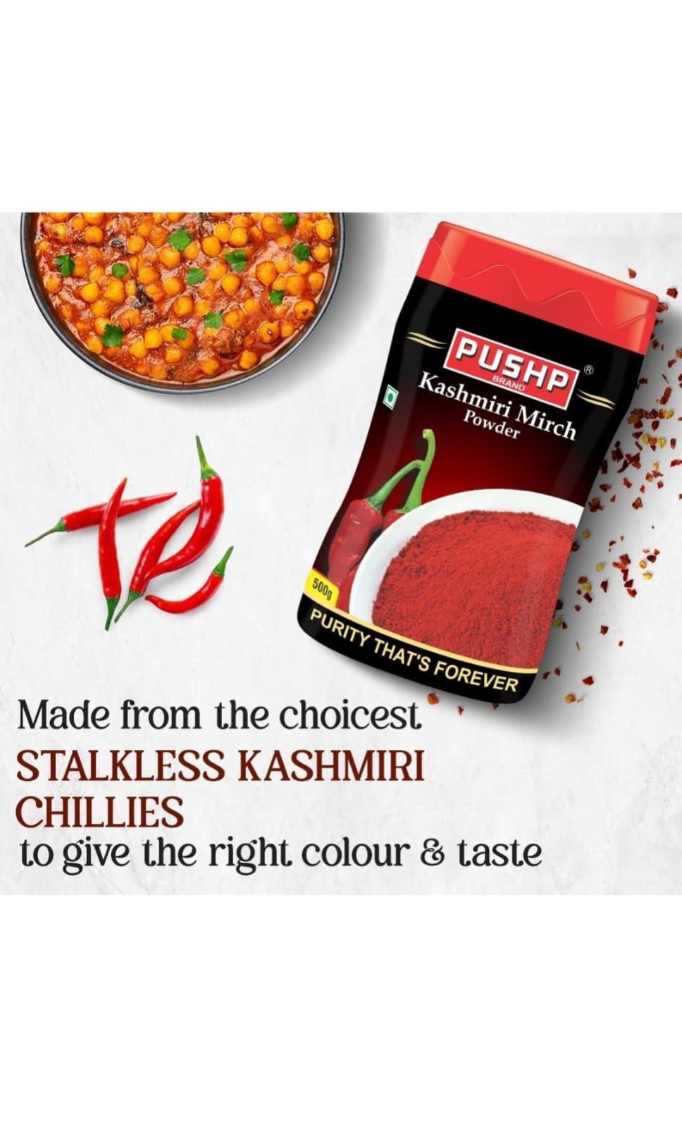 Pushp Kashmiri Mirch powder is a blend of medium spicy red pepper and is used predominantly in Tandoori preparations. It eliminates the need of adding any extra artificial color or flavors