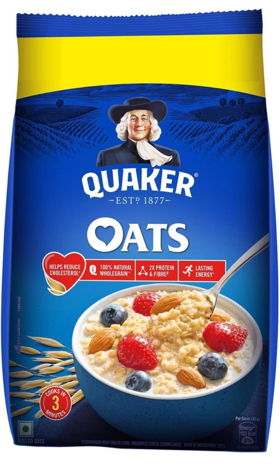 Start the day right with a bowl of nutritious Quaker Oats! These 100% Natural Wholegrain Oats have complex carbohydrates that break down slowly, providing lasting energy. Along with an active lifestyle consuming 2 bowls of oats per day provides 3g of soluble fiber and Beta-glucan; this helps reduce cholesterol as part of a diet low in saturated fat and sodium. They are also a rich source of fiber and protein.