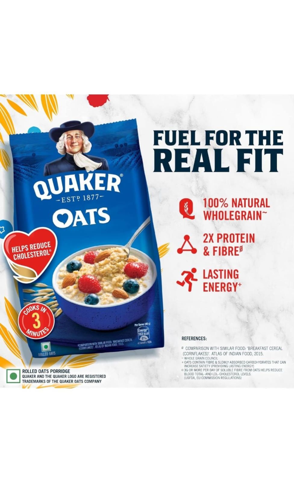 Helps Maintain Weight *Whole grain council. **Oats contain fiber & slowly absorbed carbohydrates that can increase satiety (providing lasting energy). ***3g or more per day of soluble fiber from oats helps reduce blood total- and LDL- cholesterol levels **** Comparison with similar food: ‘Breakfast cereal (cornflakes)’. Atlas of Indian Food, 2015