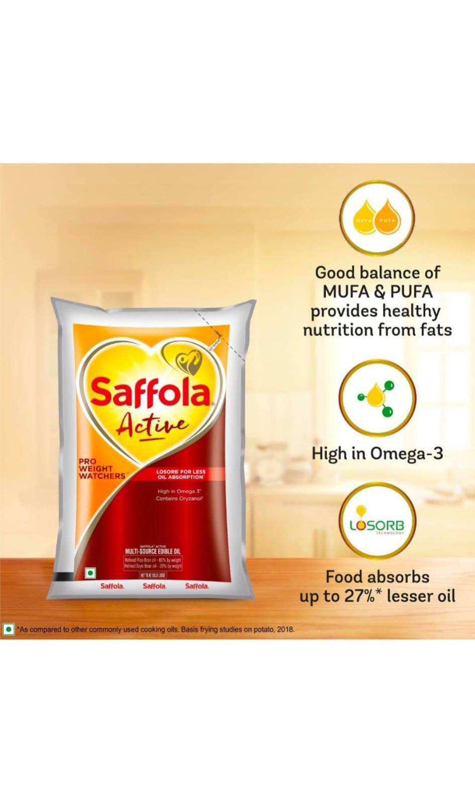 You work hard to stay fit and watch your weight. So when it comes to food, it is important that you make the right choices to ensure your efforts are fruitful. Oil is an essential ingredient in your meals. Most often, the first step will be to reduce the amount of oil used. But that might not be enough. You need to choose the right cooking oil that works as hard as you do. Saffola Active multisource edible oil comes with LOSORB™ technology which results in upto 27% lesser oil* so that you consume less oil every meal. Saffola Active cooking oil is high in Omega-3 (alpha linolenic acid), which contributes to the maintenance of normal blood cholesterol levels. Saffola Active’s Dual Seed Technology gives you the goodness of 2 oils in 1. It ensures a good balance of MUFA and PUFA for better nutrition through fats, compared to single seed oils. Since quantity of oil consumed every day is as important as the quality of oil you choose for daily cooking, Saffola Active multisource edible vegetable oil helps you ensure both. Boost your efforts to stay active by choosing Saffola Active! *as compared to commonly consumed cooking oils; basis frying studies on potato, 2018.