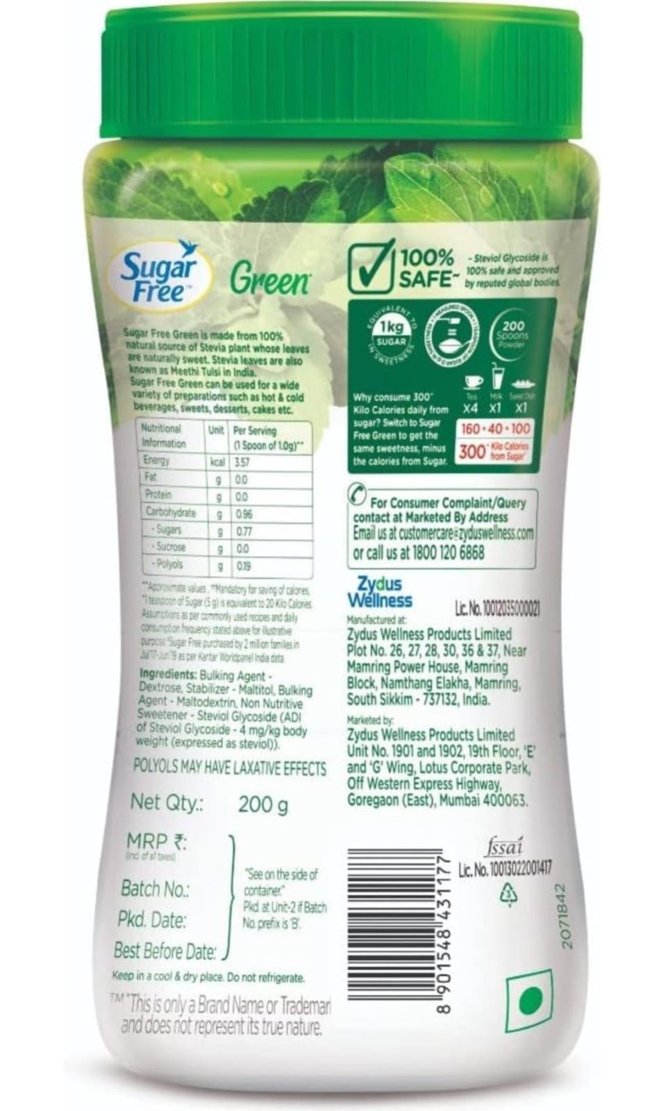 Sugar Free Green Stevia Jar, 200 g | 100% Plant-based Natural Sweetener | Equivalent to Sweetness from 1Kg Sugar | 100% Natural Stevia leaves| Sweet like Sugar but with zero calories|
