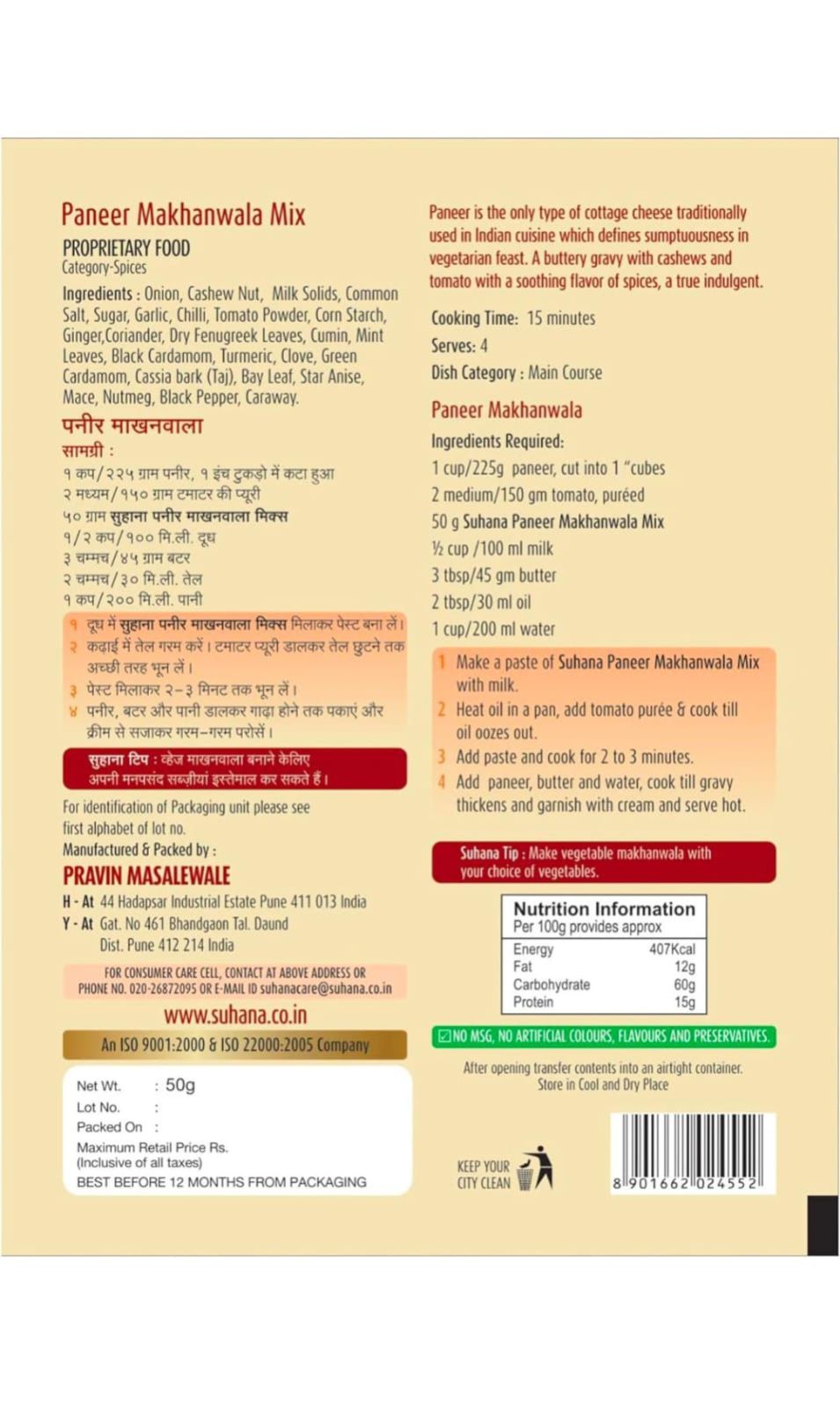 Suhana Paneer Makhanwala 50g Pouch | Spice Mix | Easy to Cook | Pack of 3 | Profit and Grocery