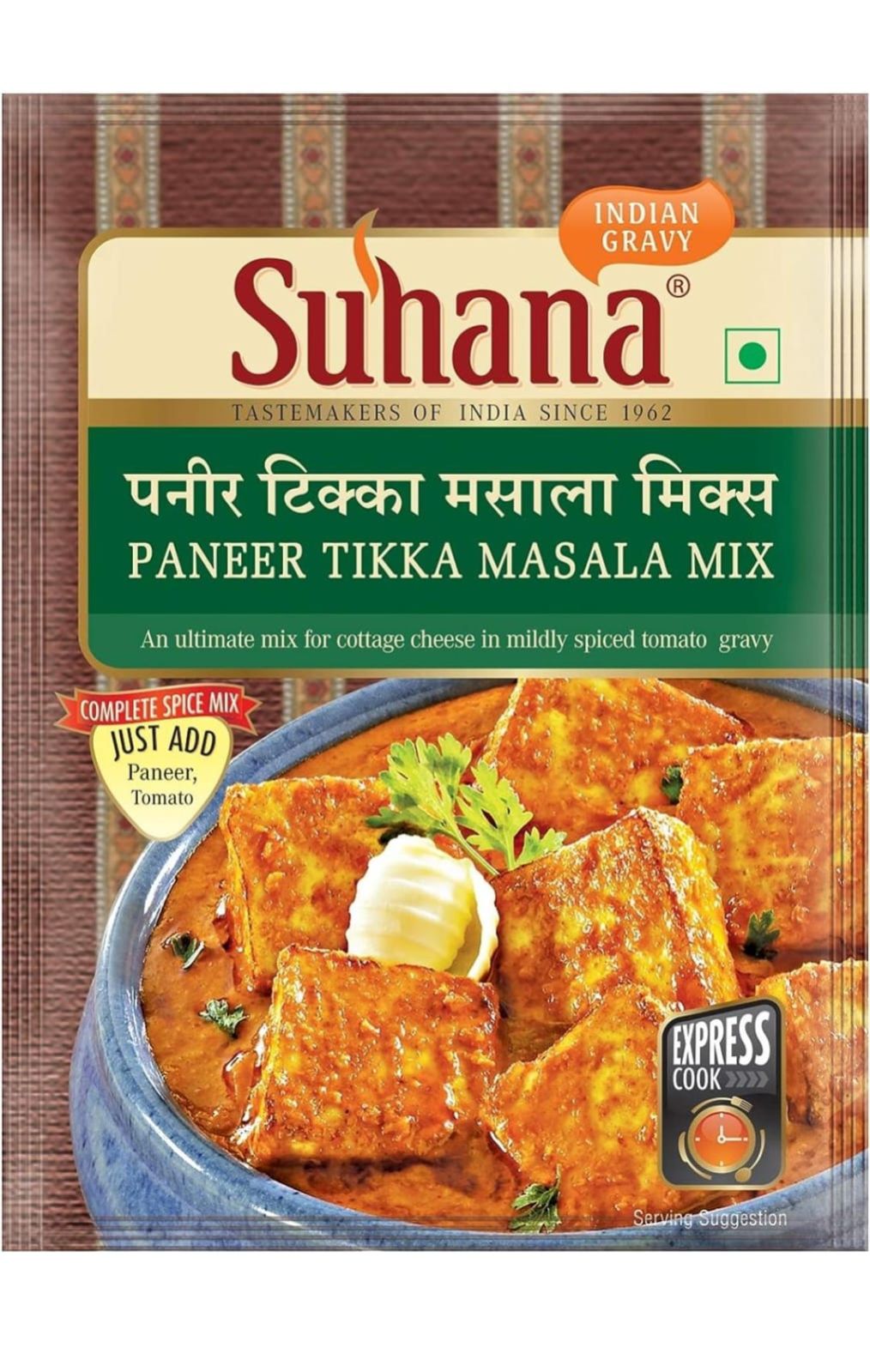 Suhana Paneer Tikka Masala Mix, this sumptuous blend of spices like fenugreek, cinnamon and creamy cashew nuts produces a memorable cottage cheese dish that will appeal to all.