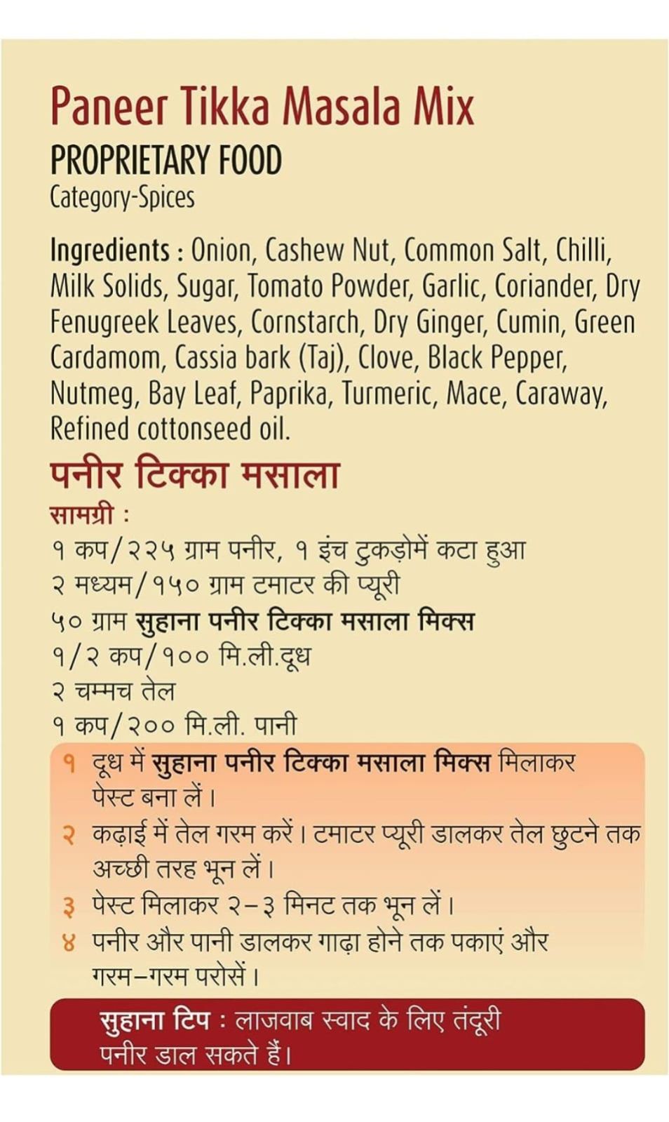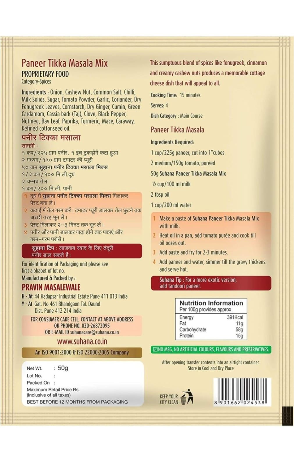 Suhana Paneer Tikka Masala 50g Pouch | Spice Mix | Easy to Cook | Pack of 3 | Profit and Grocery