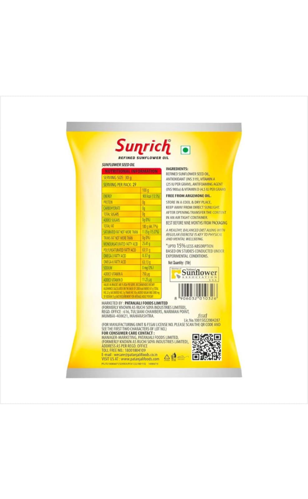 Sunrich Sunflower Oil Pouch, Edible Oil for Cooking & Frying, Everyday Kitchen Use, Vegetable Oil, 899 Gm/910gm | Profit and Grocery