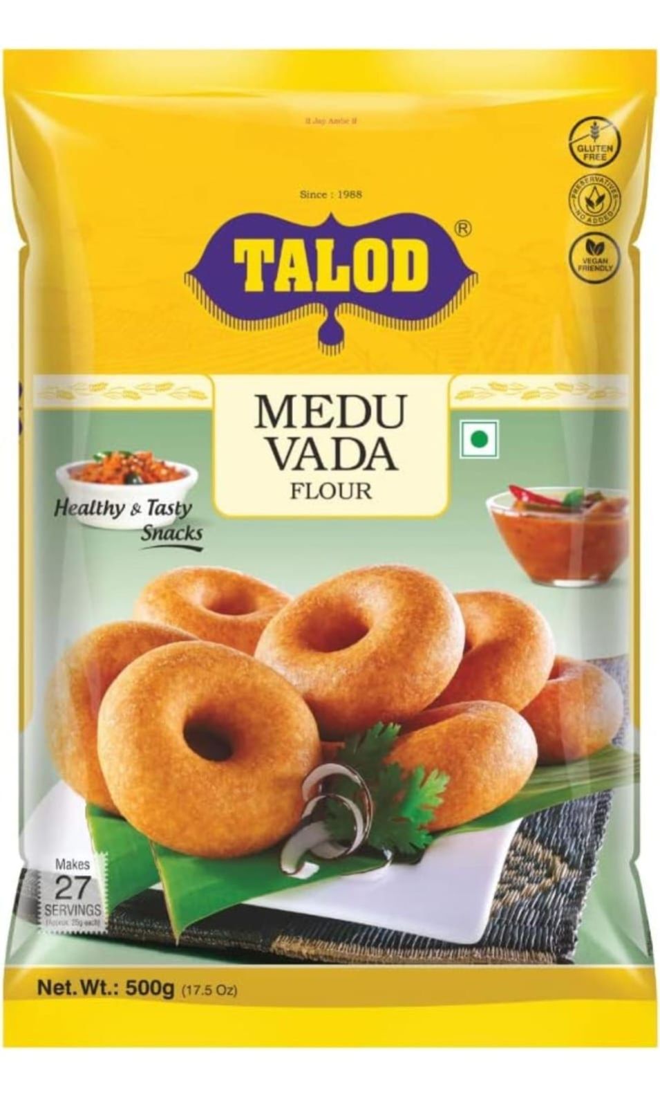 Talod Instant Mix Medu Vada Flour (Pack of 2 * 500 g) | 100% Vegetarian, Wheat Gluten Free, Vegan Friendly, No Preservative, No Artificial Flavours, No Artificial Colors, No MSG | Makes 27 Servings in 30 Mins from 500 g Pack | Profit and Grocery