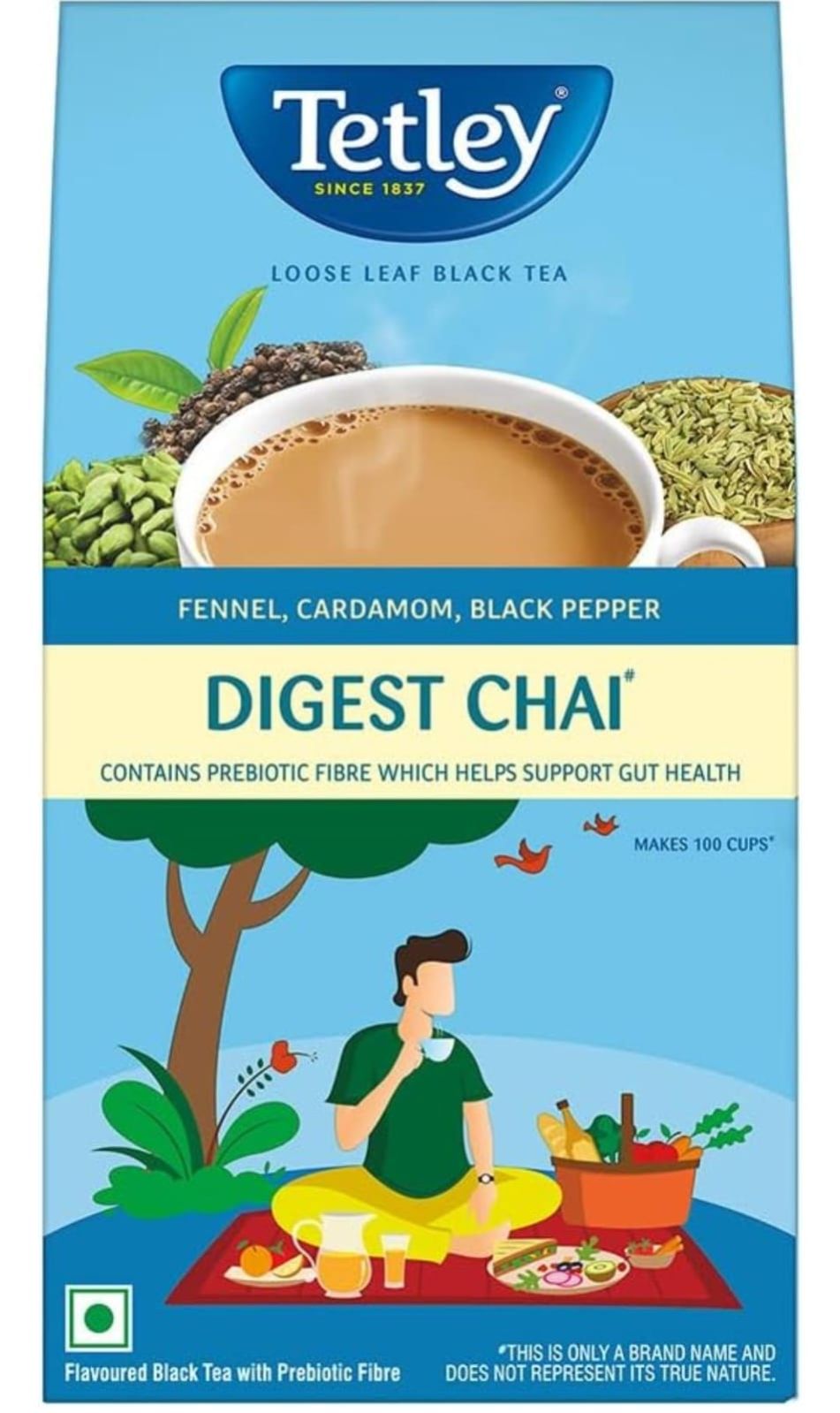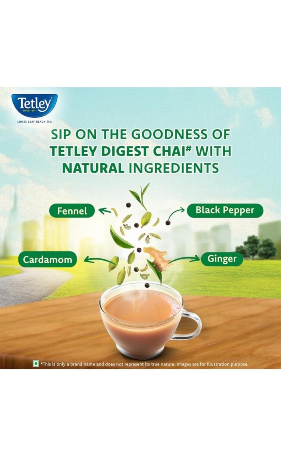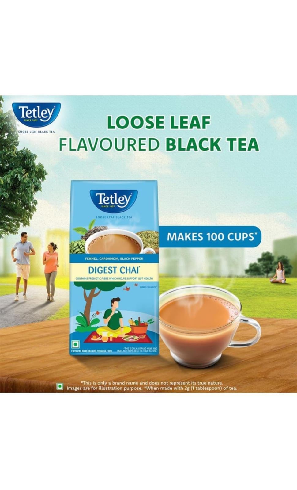 Refresh, rejuvenate, and relax with Tetley Digest Chai#. Relish the delightful sips of this digestive chai made with natural flavours of cardamom, black pepper, ginger & fennel. Made with the goodness of prebiotic fibre which helps support gut health. Make up to 100 cups* of Tetley Digest Chai# where each sip is packed with flavour & fragrance from carefully sourced premium ingredients. To make this tea with digestive properties, bring a mix of water & milk in a ratio of 60:40 to boil. Add 1 tbsp (2g/Cup) of Tetley Digest Chai# and boil for 3-4 mins. Add sugar to taste and enjoy wellness in every cup. #This is only a brand name and does not represent its true nature *When made with 2g (1 tablespoon) of tea.