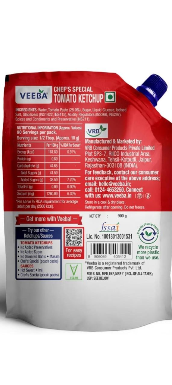 Veeba Tomato Ketchup Chef’s Special (900g) | Super Saver Offer Pack | Non-GMO | Quality Tomato Ketchup | Profit and Grocery