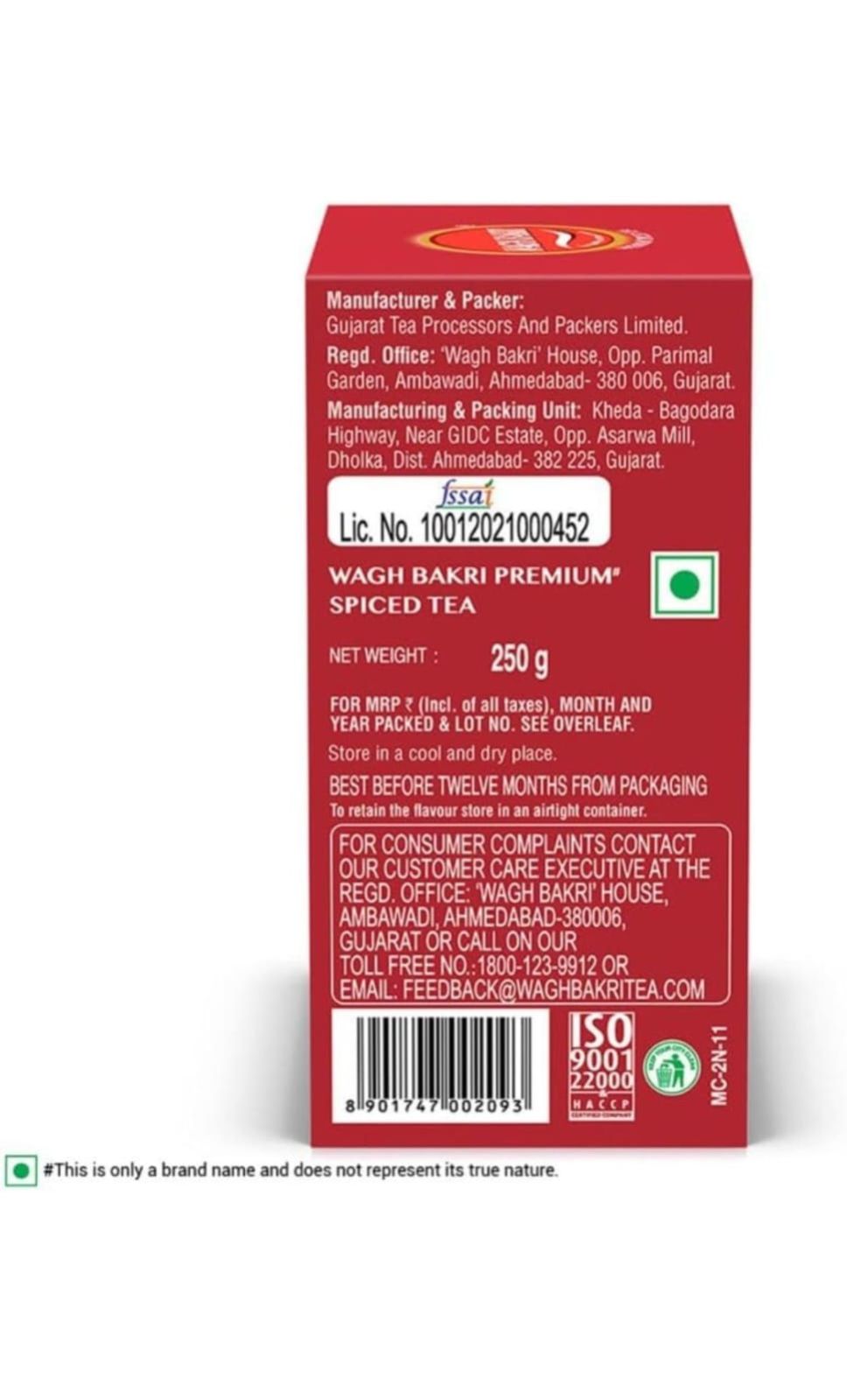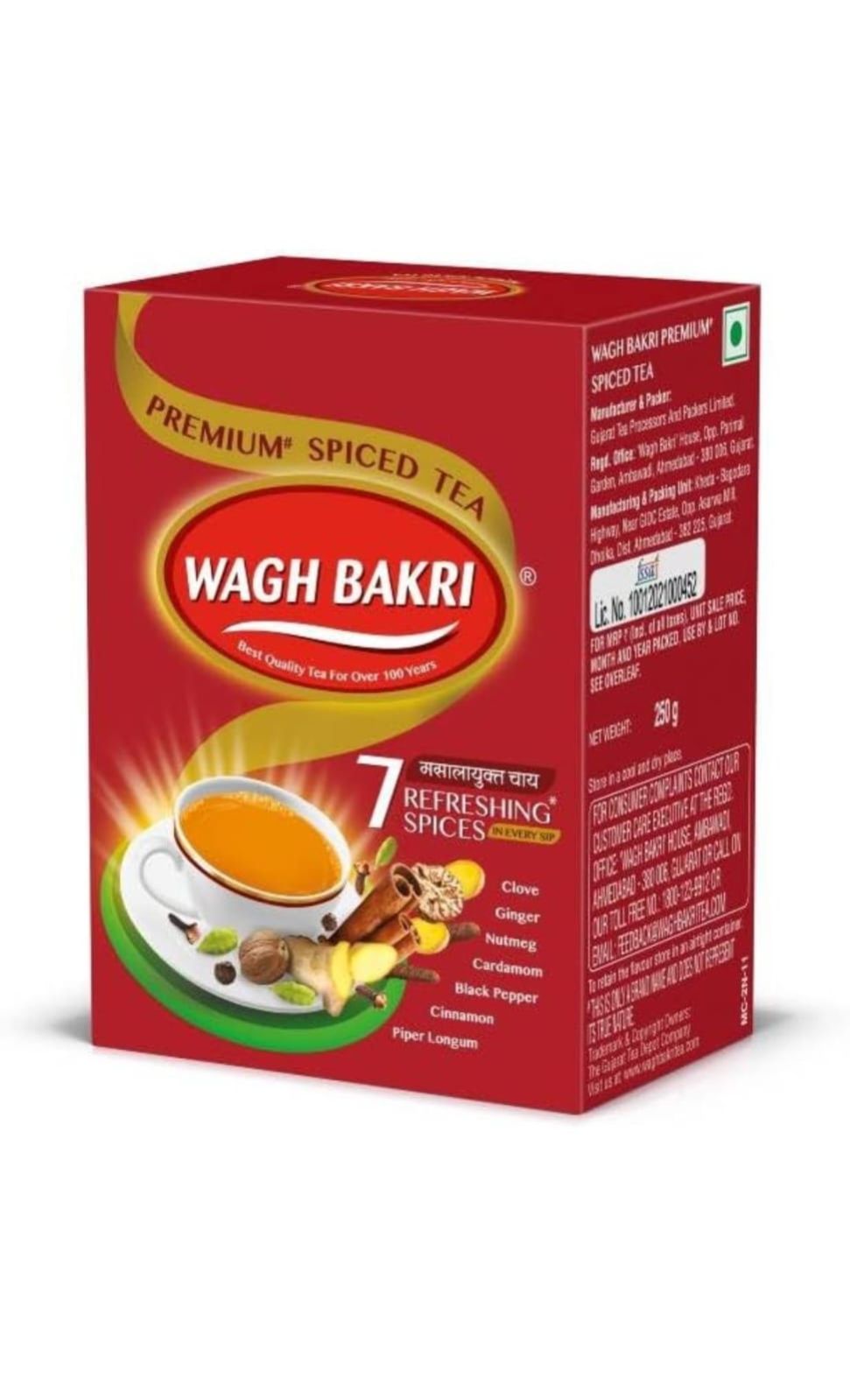 A refreshing blend for a refreshing mood. Looking for a tea that is more than just a tea? Look no further as Wagh Bakri brings you Premium Spiced Tea, an invigorating blend of Wagh Bakri tea combined with the goodness of Indian spices. Wagh Bakri has been known for its best quality tea for over 100 years, helping Indians brew moments of togetherness and stronger relationships. Enjoy the premium taste of our tea while taking care of yourself with a flavourful cup that weaves malty flavours of tea and exotic flavours of Indian spices like Cardamom, Cinnamon, Black Pepper, Clove, Ginger, Piper Longum and Nutmeg. Make every moment exciting. Steep for four to six minutes, depending on desired strength you require for that perfect cup and keep coming back to Wagh Bakri® Spiced Tea when exertion hits, at times of illness, or to turn your family time into happy times. *Based on the information given on spices board Govt. of India. The claims have been backed up by various independent studies. #This is only a brand name and does not represent its true nature.*Our Product is not intended to diagnose, treat, or prevent any disease or condition. The Claims are based on benefits concluded by Ayurvedic literature, publicly available; neither intended to be medical advice nor an alternative to medical attention and the same is subject to consumption of healthy balanced diet.”